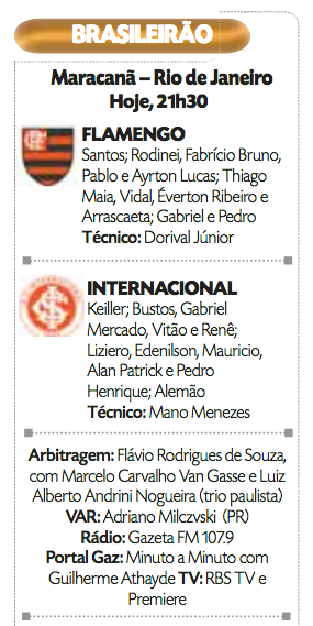 O volante Gabriel sofreu uma grave lesão no joelho e só voltará em 2023. O também volante Johnny fica de fora após receber o terceiro cartão amarelo. Já o meia Carlos de Pena foi liberado para acompanhar o nascimento da filha, e o atacante Taison perdeu o pai nessa terça-feira. O goleiro Daniel, que pode deixar o clube no final desta temporada, e o atacante Wanderson continuam fora por questões físicas. “O sistema é mais importante do que tudo, embora saiba que, como característica individual, não temos alguém como Gabriel para repor”, admitiu o técnico Mano Menezes. Ele deve apostar em Liziero e Edenilson como volantes para tentar segurar o embalado Rubro-Negro carioca, empurrado por mais de 55 mil torcedores.