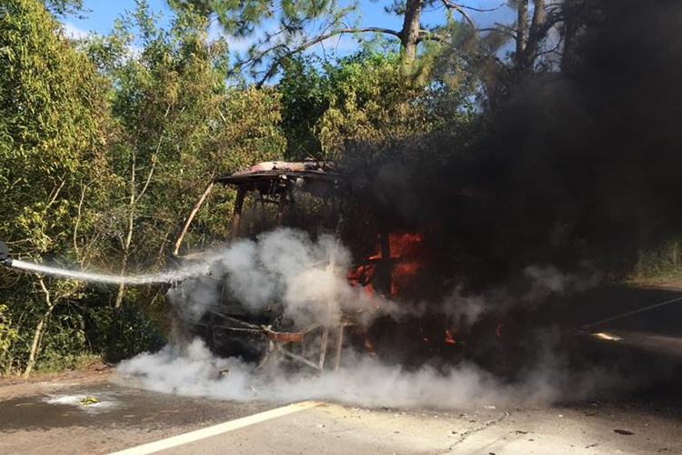 Por sorte, os cerca de 20 passageiros que estavam no coletivo conseguiram sair e ninguém se feriu. Já o ônibus foi destruído pelas chamas.