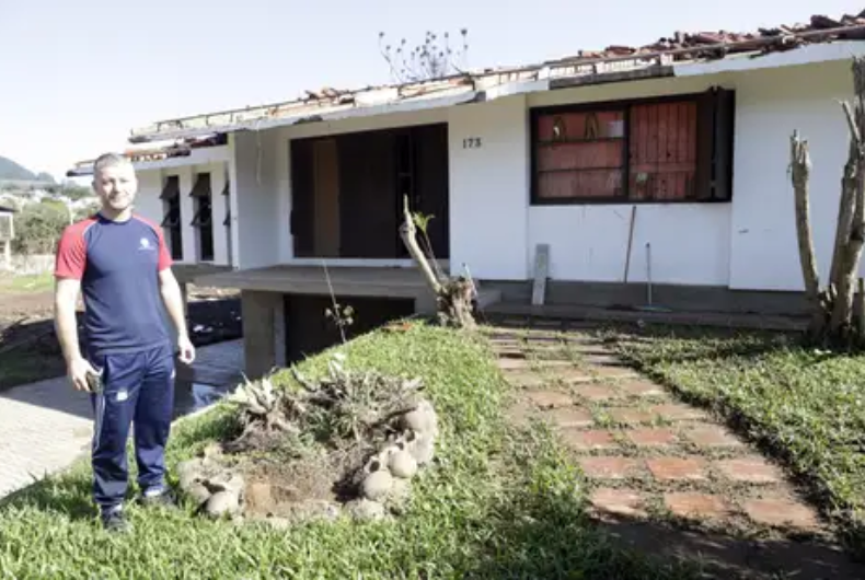 O policial civil Glauco Kummer, de 45 anos, lavava a moto no terraço de uma casa que perdeu boa parte do telhado. Ele contou que a água subiu 1 metro acima da residência que tem um andar, com cerca de 350 m² em cada piso.