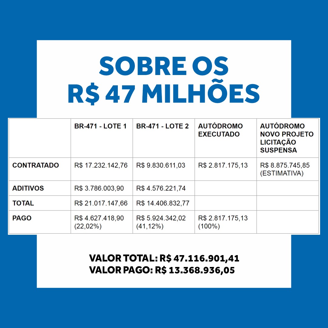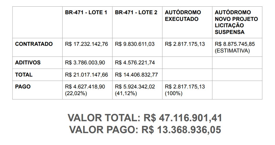 Segundo Helena, a soma dos valores dos projetos da duplicação da BR-471 (lotes 1 e 2) e do Autódromo Internacional é de R$ 47.116.901,41. Ela alega que, até então, foram pagos R$ 13.368.936,05. Estes números teriam sido citados pelo MP como suspeitos de desvio, o que a prefeita rebate. “O promotor disse que foi dado prejuízo para o erário de R$ 47 milhões, mas está aí, são projetos sendo executados e outro que nem foi licitado ainda.”