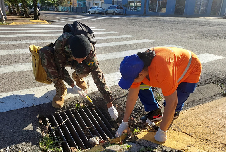 Equipes do Setor de Vigilância e Ações em Saúde, com o apoio de soldados do 7º Batalhão de Infantaria Blindado (7º BIB), e de servidores das secretarias de Obras e Infraestrutura, e de Serviços Públicos, realizaram uma força-tarefa nesse sábado, 23, durante todo o dia, para aplicação de baraticida em gel, em bueiros da região central de Santa Cruz do Sul.