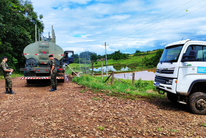 Com o apoio do 7º BIB, que mais uma vez cedeu um caminhão-pipa, a força-tarefa continuou na comunidade de Alto Paredão. Um veículo da Prefeitura levou à localidade de Linha Brasil, em Monte Alverne.