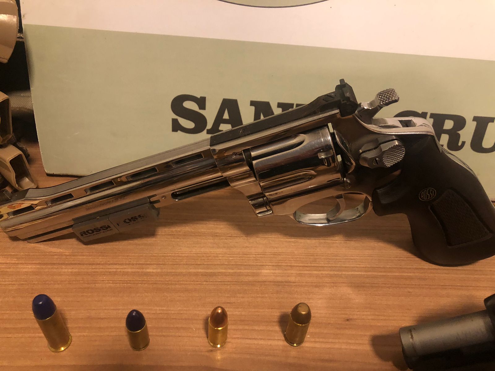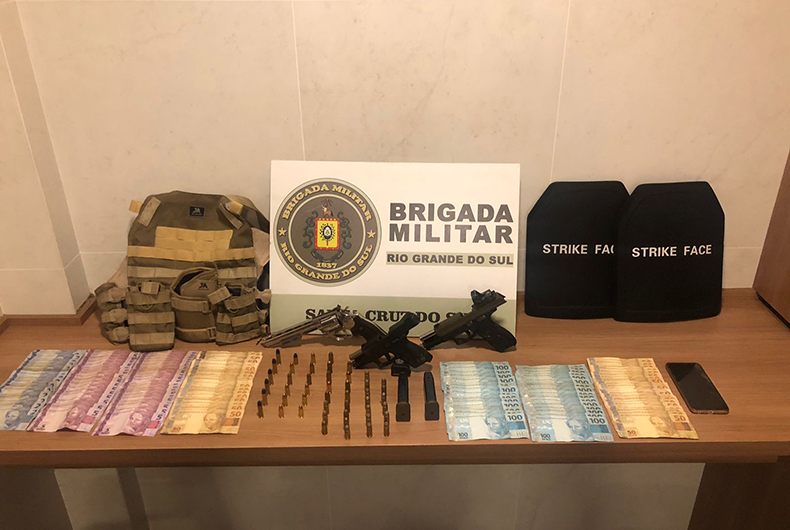 Com ele, foram apreendidas três armas de fogo, sendo um revólver calibre 38 municiado; uma pistola calibre 9 milímetros da Taurus, municiada com 12 cartuchos e que foi furtada em 24 de julho em Santa Cruz; e outra pistola calibre .40 municiada com 15 cartuchos. Ainda, foi apreendido um carregador sobressalente com numeração suprimida, municiado com 14 cartuchos, um colete balístico com placas fabricadas em Israel, um celular e R$ 5.224,00 em dinheiro.