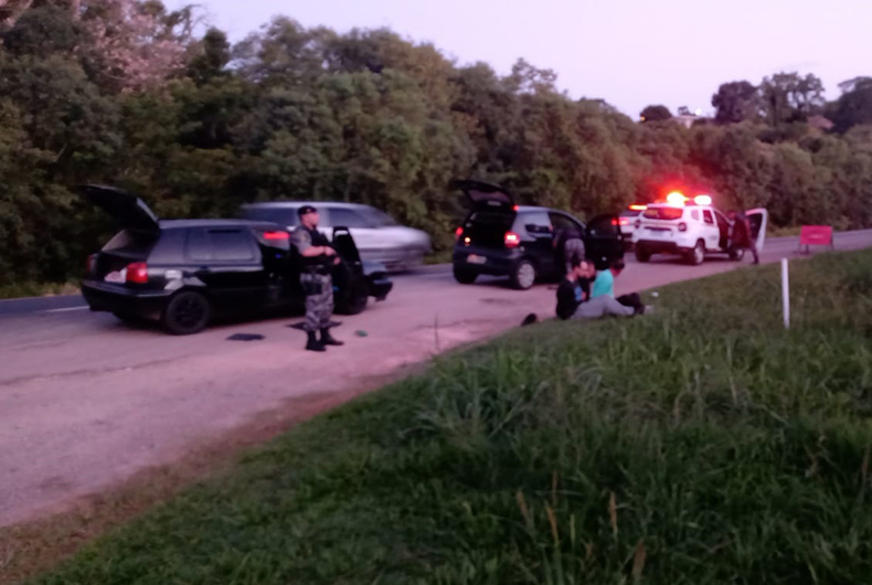 Ao longo desta sexta-feira, uma movimentação suspeita de carros e motos na região alertou os policiais, que acionaram uma guarnição da FT. Por volta das 18h20, na BR-471, nas imediações da ERS-403, no chamado trevo do Prado, foi realizada uma abordagens a dois carros pretos, um Volkswagen Fox e um Volkswagen Golf, ambos com placas de Rio Pardo. No Fox, onde estava um homem de 50 anos, foi encontrado um tijolo de maconha e um facão.
