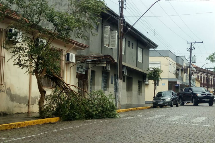 Com o vento, árvores e fios acabaram caindo, deixando vários pontos sem energia elétrica. O comércio teve de ser fechado, pois a água que veio da chuva invadiu algumas lojas.