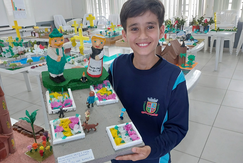 Kaio Rodrigues, de 9 anos, utilizando papel machê, esbanjou talento ao reproduzir os bonecos do Viaduto Fritz e Frida, sem esquecer das flores. “Fui lá muitas vezes com minha família, e acho legal lá”, contou.