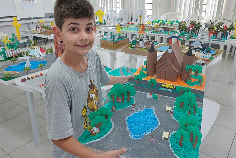 Orgulhoso do seu trabalho estava o garoto Arthur Vicente Correa Kretzmann, de 10 anos, que reproduziu a Catedral São João Batista e a Praça Getúlio Vargas. “É um dos lugares mais bonitos de Santa Cruz, e gosto de ir lá com minha família. O que aprendi com este trabalho não vou mais esquecer”, disse.