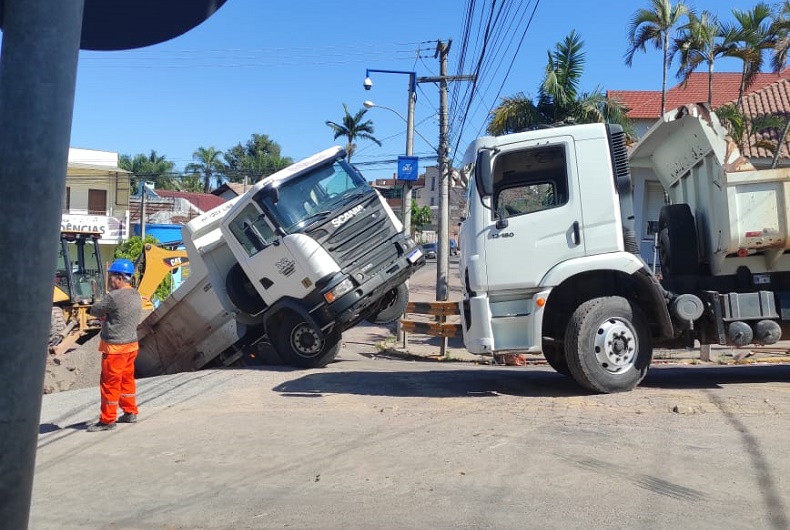 A reportagem conversou com os trabalhadores, que explicaram a situação: o caminhão estava sendo utilizado para retirar os entulhos do buraco. Já carregado, no entanto, acabou pesando e indo parar dentro da cratera. Ninguém ficou ferido. Outro veículo será levado ao local para retirar o caminhão.