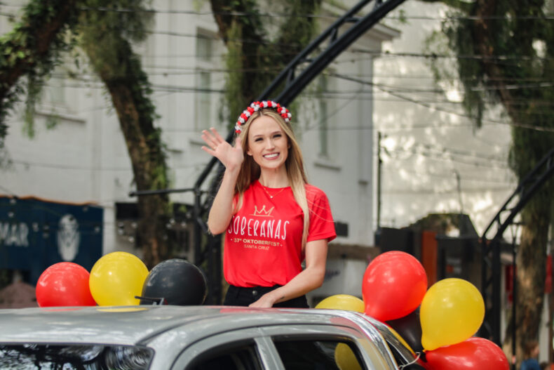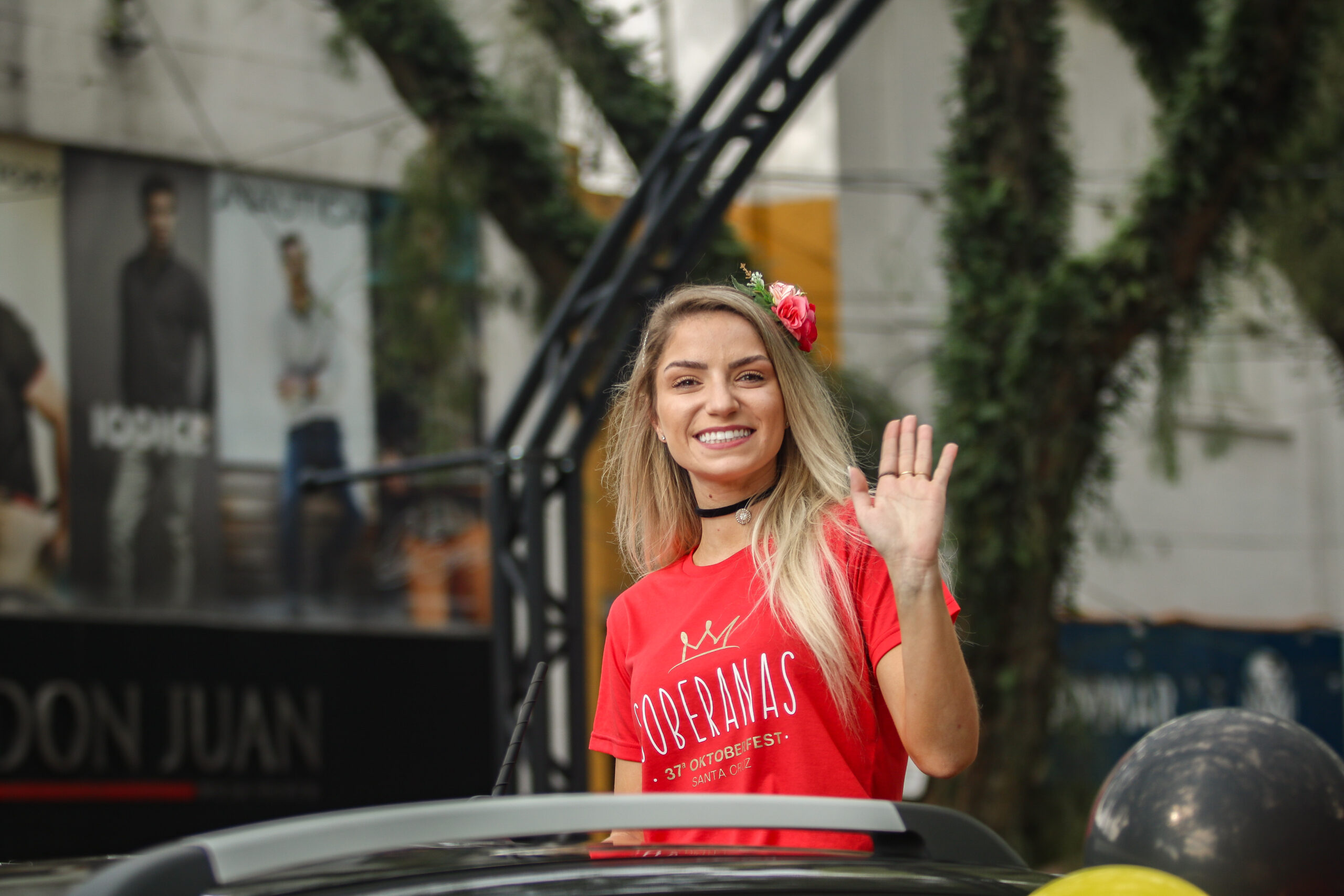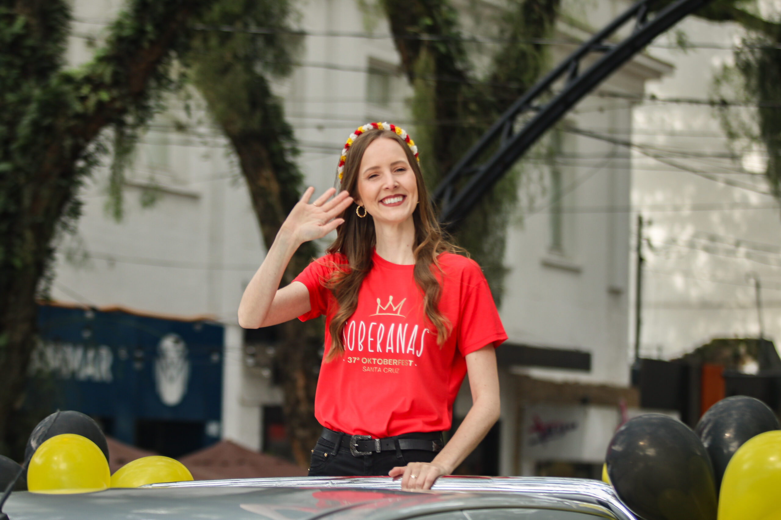 O desfile das candidatas nos veículos contou com a presença ilustre da rainha da 36ª Oktoberfest, Luana Rech, que assistiu à carreata na Rua Marechal Floriano. “Esse ciclo está finalizando. Vim acompanhar as meninas porque a gente sempre relembra como foi nosso ano, como foi nosso momento. É muito especial, eu amo fazer parte da Oktober e poder estar perto ajudando é muito gratificante para mim.”