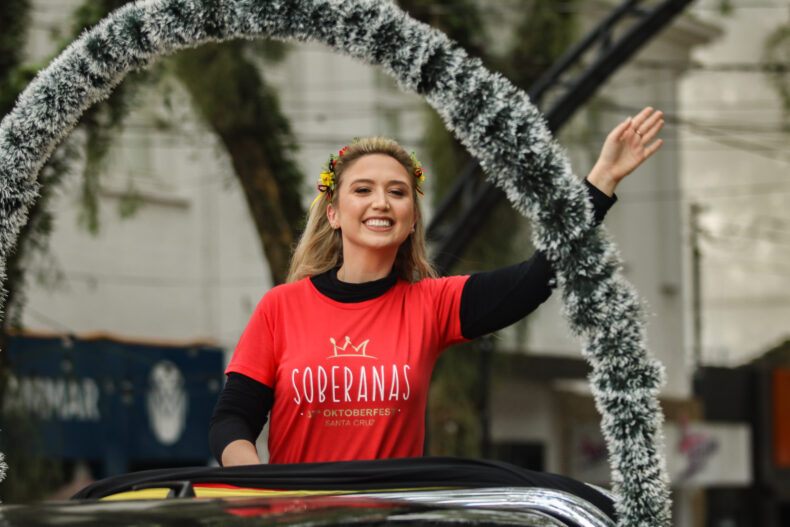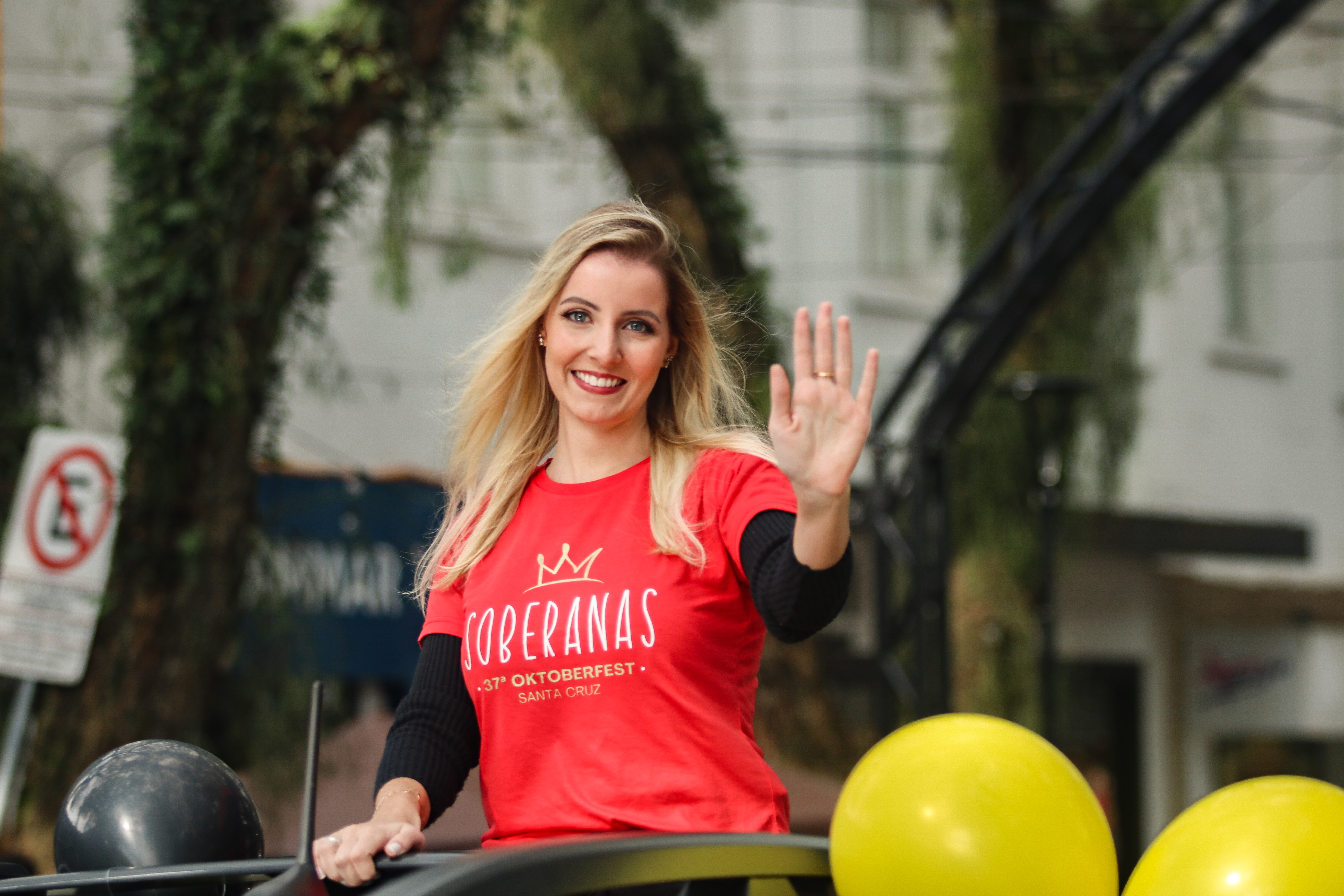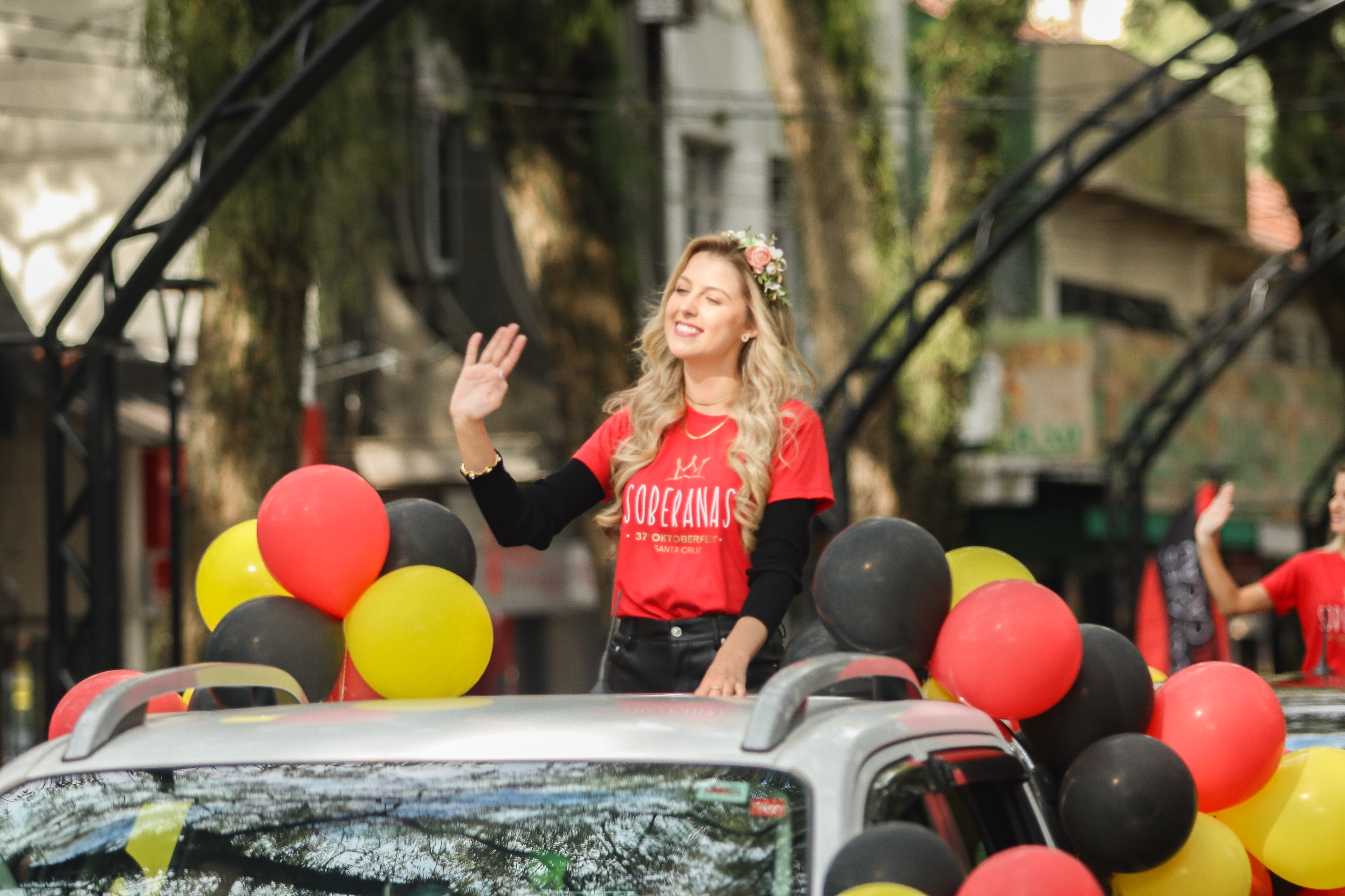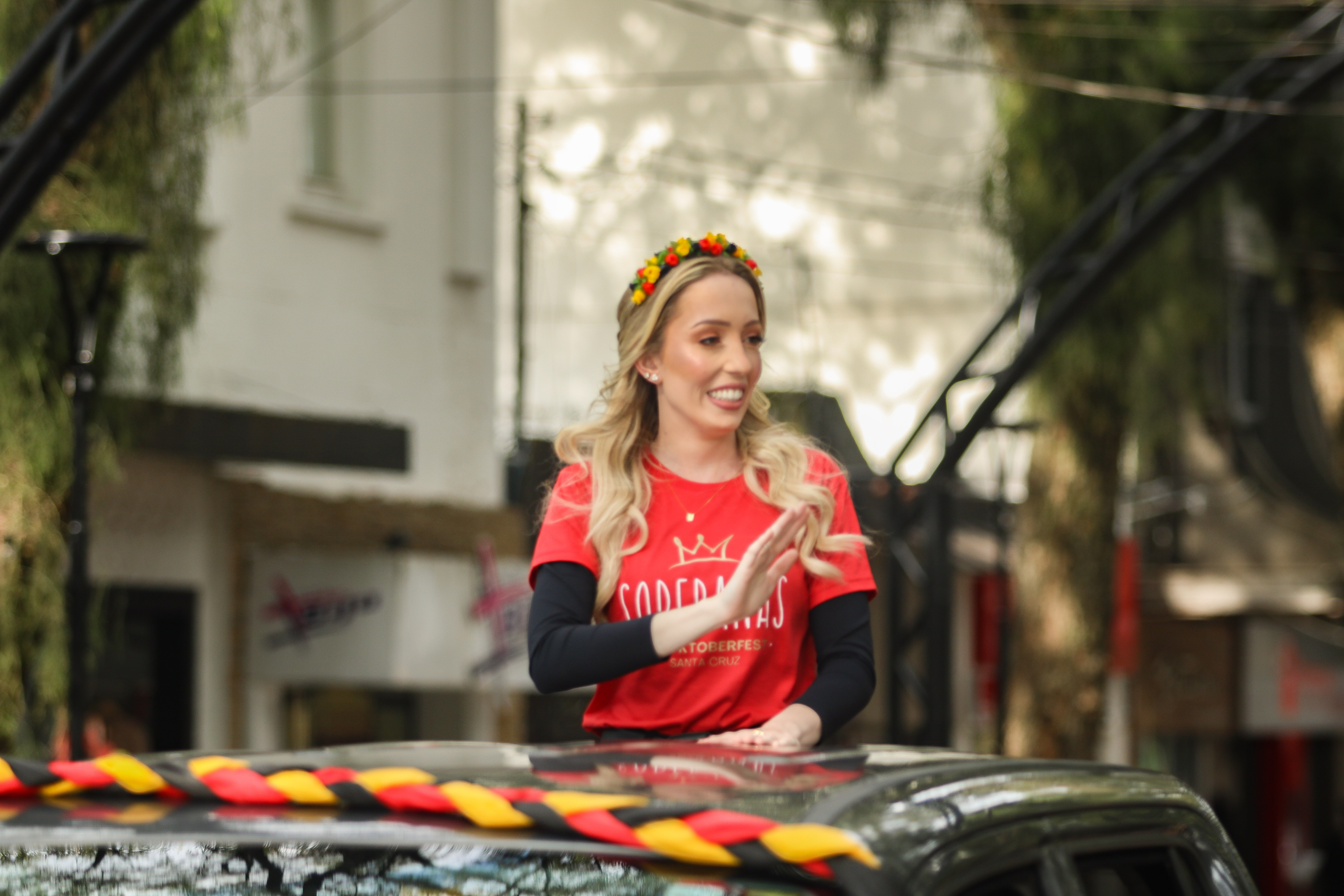O desfile das candidatas nos veículos contou com a presença ilustre da rainha da 36ª Oktoberfest, Luana Rech, que assistiu à carreata na Rua Marechal Floriano. “Esse ciclo está finalizando. Vim acompanhar as meninas porque a gente sempre relembra como foi nosso ano, como foi nosso momento. É muito especial, eu amo fazer parte da Oktober e poder estar perto ajudando é muito gratificante para mim.”