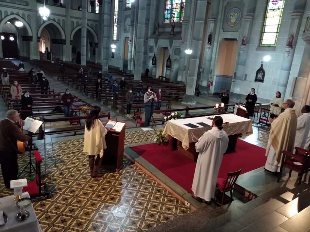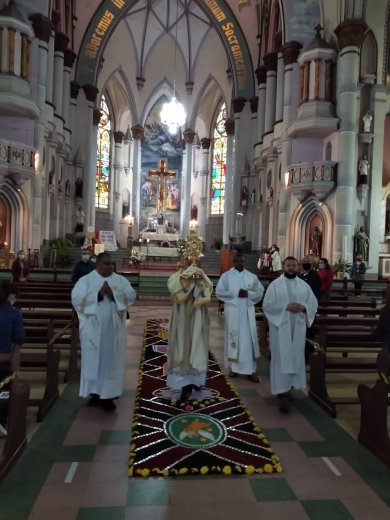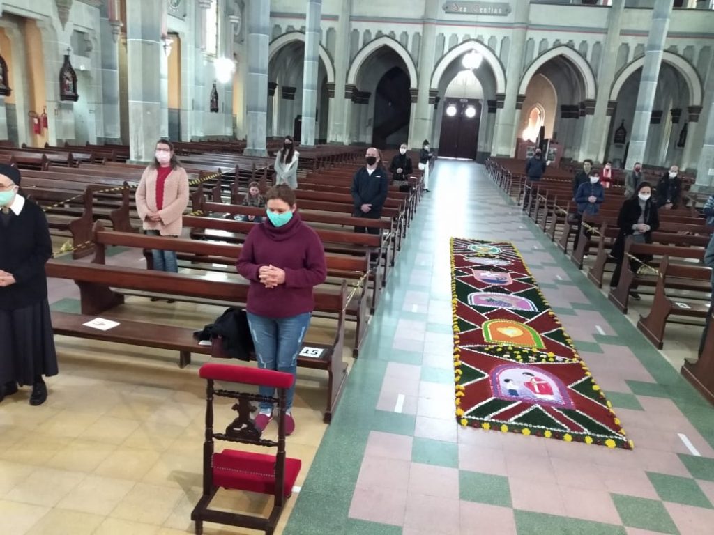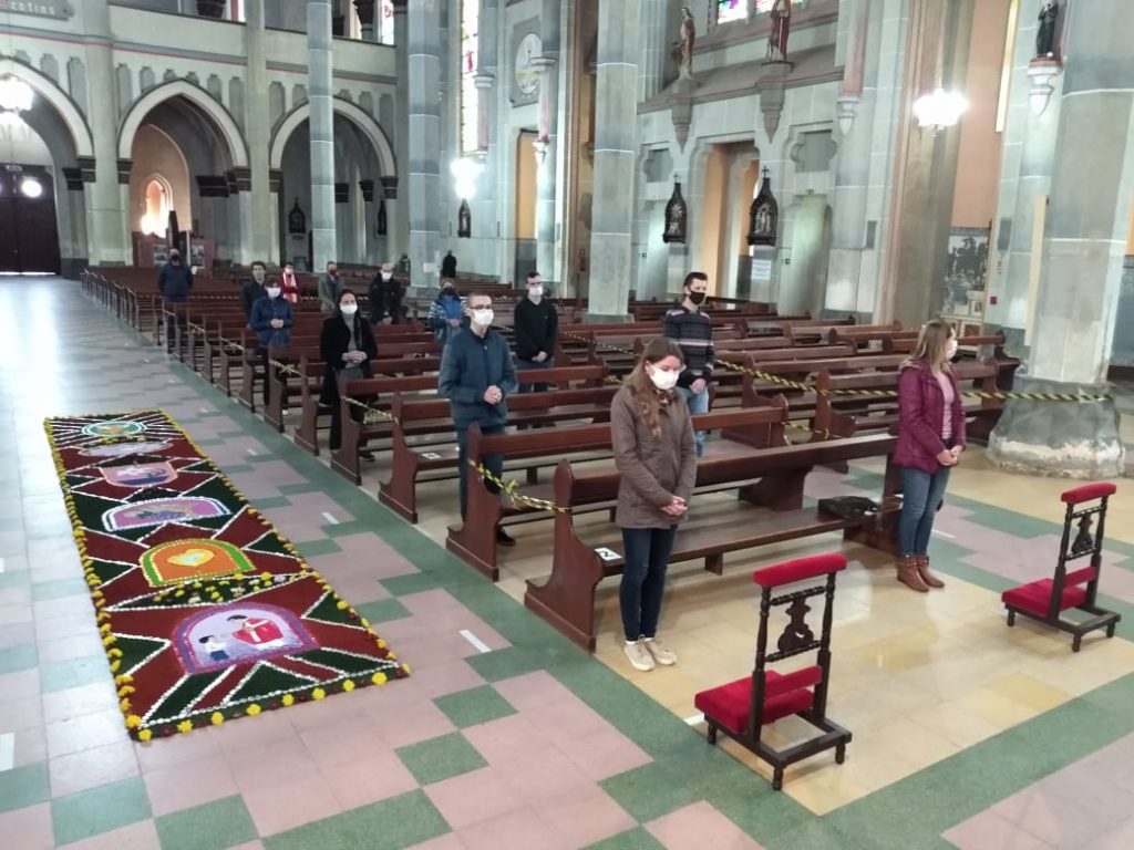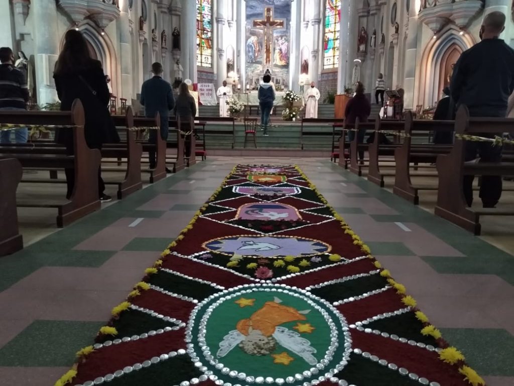 A celebração de Corpus Christi sofreu alterações por conta da pandemia do novo coronavírus neste ano. Não ocorreu a tradicional confecção do tapete de serragem na frente da Catedral São João Batista, em Santa Cruz do Sul. Contudo, as 30 pessoas que puderam participar da missa na manhã desta quinta-feira, 11, inscritas previamente na secretaria, puderam prestigiar a beleza dos tapetes dentro da catedral.
