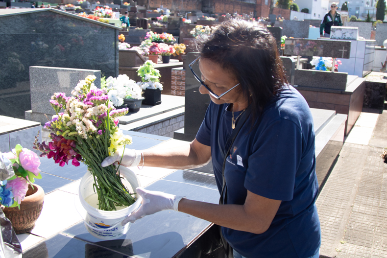 Uma das que realizava esse trabalho durante a manhã era Sônia Meireles da Silva, que estava acompanhada dos netos. Ainda que seja incomum a presença de crianças no local, ela diz que costumam ir todos os anos. “Eu acho bom que venham e eles também gostam. É importante valorizar a família e a memória daqueles que já morreram”, disse. Equipes da Prefeitura também atuaram ao longo do dia para auxiliar no recolhimento do lixo e prestar auxílio à população durante as visitas.