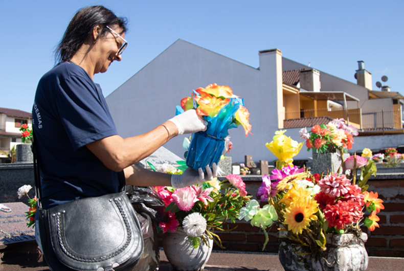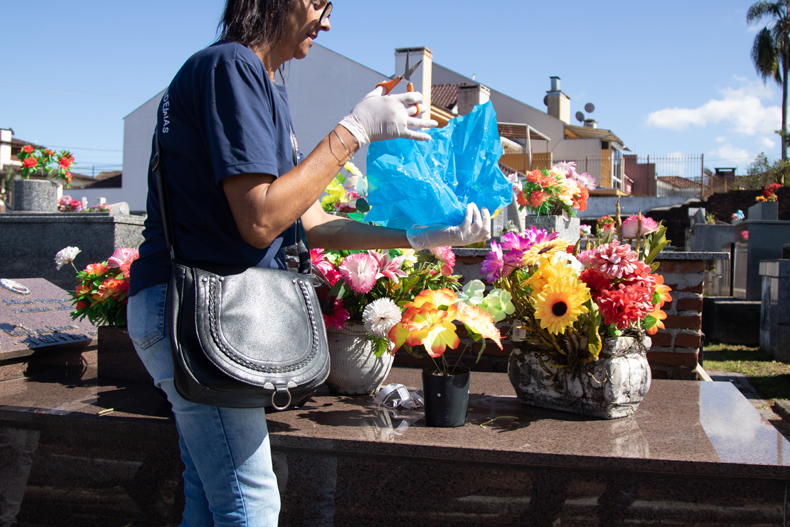 Enquanto os visitantes depositavam vasos com flores nos túmulos dos dois cemitérios, os agentes de endemias estavam atentos para evitar a proliferação do mosquito da dengue. Isso porque muitos recipientes usados são propícios para a formação de criadouros do Aedes Aegypti. Conforme a agente Rosane Figueiredo, a principal recomendação é retirar o papel celofane ou o plástico que envolve as flores antes de colocá-las sobre as sepulturas. Além disso, é preciso ter atenção com a espécie e evitar plantas que tenham folhas grandes ou formatos que possam armazenar água, como as bromélias.