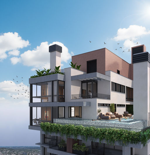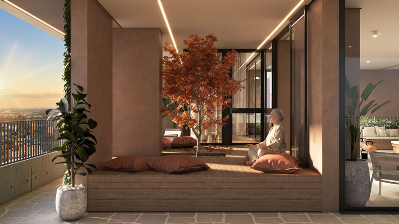 Já no 16º andar, em meio aos pavimentos com apartamentos, será instalado o Middle Garden, com espaços de integração à natureza e voltados aos pets. No topo, estarão dois rooftops, Equilibrium e Soul, além de um mirante, com vista panorâmica para a cidade.