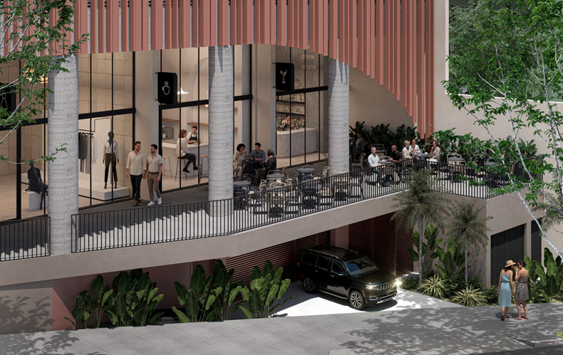 No térreo, haverá quatro lojas e um amplo terraço. Além disso, estarão concentradas ali áreas de conveniência, como um mini mercado, lavanderia no sistema pay per use e espaço para recebimento de encomendas. Logo acima, haverá um mezanino, com espaço de coworking e sala de reuniões com estrutura para podcasts, apresentações e videoconferências.
