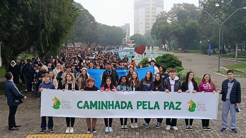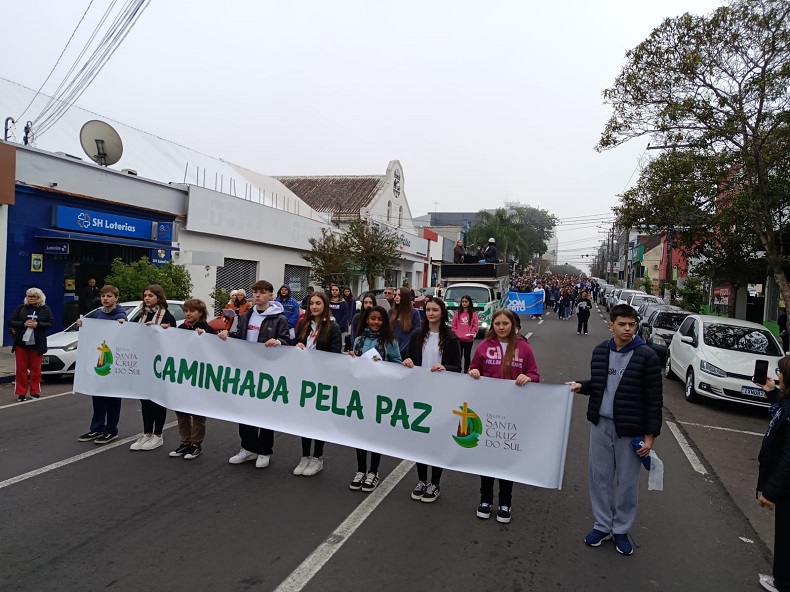 Santa Cruz do Sul realizou na manhã desta quarta-feira, 11, um momento de reflexão e união. Alunos das redes pública e privada participam de uma caminhada em celebração ao Jubileu pela Paz. Com o tema Felizes os que promovem a paz, baseado na passagem bíblica de Mateus 5,9, o evento, promovido pela Diocese de Santa Cruz, visa sensibilizar a sociedade em geral sobre a importância de construir um ambiente de respeito, justiça e paz.