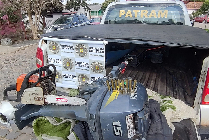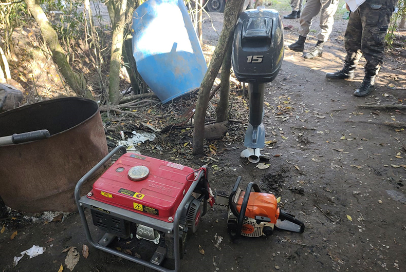 No mesmo local, após inspeção dos policiais, foram encontradas 12 munições de calibre 22 e oito cartuchos deflagrados calibre 36. Também foram localizados quatro cães em situação de maus tratos, quatro embarcações de pequeno porte, dois motores de popa de 15HP, um gerador de energia, uma motosserra e aproximadamente 750 metros de redes de pesca de malhas variadas.