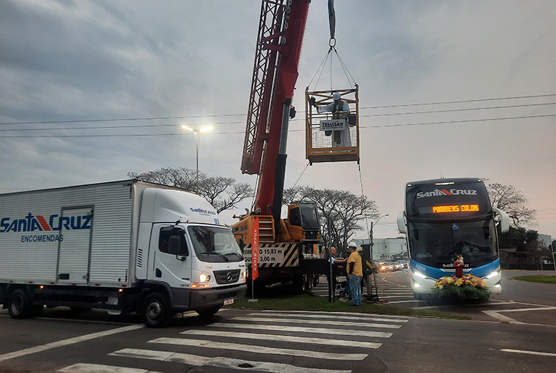 À frente da carreata foi uma imagem de São Cristóvão, padroeiro dos motoristas. O santo foi sobre um altar acoplado na parte dianteira de um ônibus. “A carreata é um momento muito emocionante, principalmente a benção, porque os motoristas precisam ter a religiosidade ao lado do trabalho que desempenham, pelo progresso do Brasil”, comentou a presidente da comunidade da Paróquia Ressurreição, Clarissa Weigel.