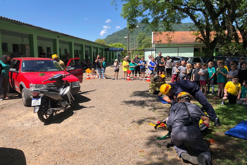 Socorristas do Corpo de Bombeiros de Vera Cruz realizaram uma simulação de resgate na Escola Guilherme Fischer, em Vale do Sol, na manhã desta quinta feira, 24. A ação aconteceu no pátio do educandário e contou com a parceria dos voluntários do programa Trânsito Vida e CFC Machado de Vera Cruz.