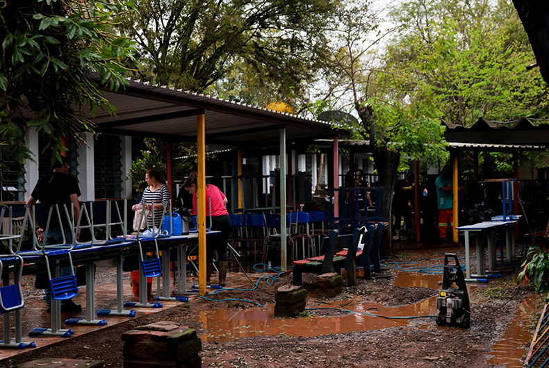 Cerca de 50 pessoas auxiliavam na limpeza do espaço. Entre eles professores, funcionários e equipes do Corpo de Bombeiros e da Superintendência dos Serviços Penitenciários (Susepe). “No sábado anterior ao ocorrido, nós realizamos reunião com as famílias. Estávamos comemorando o cenário positivo da escola. Com a enchente, apenas 10% dos estudantes não foram atingidos. Apesar de tudo, o que nos deixa felizes em meio a isso tudo é essa solidariedade.”
