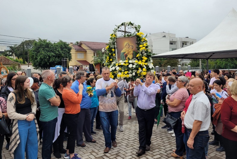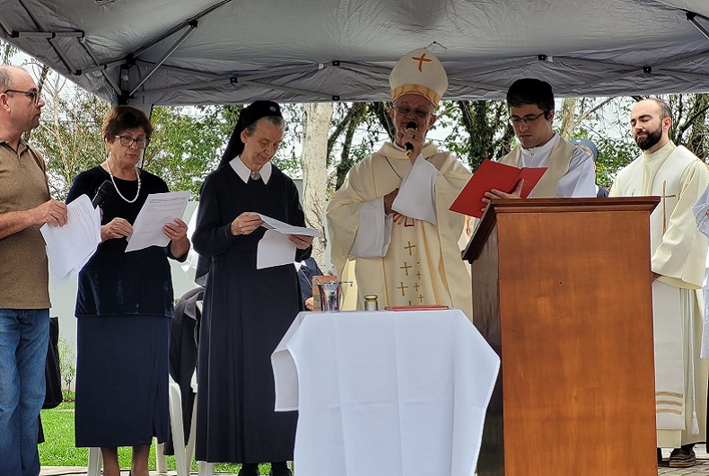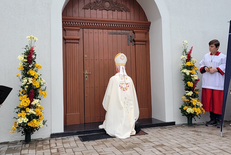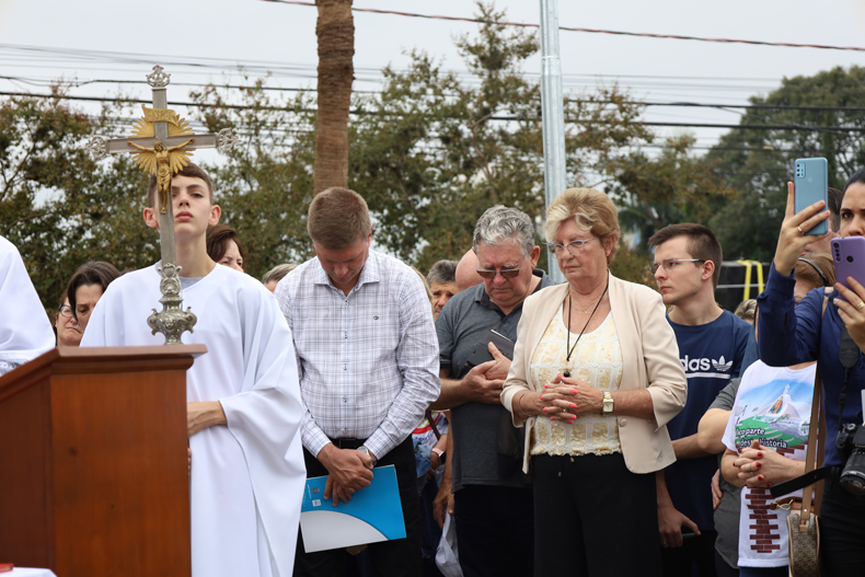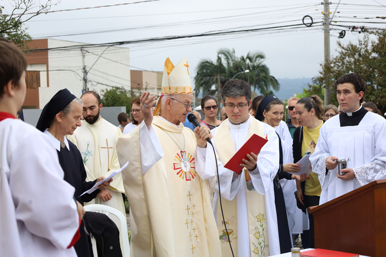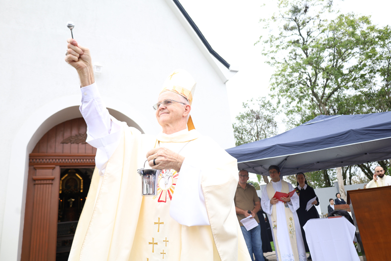 Depois, o religioso ungiu as paredes com óleo, consagrado e abençoado durante a Semana Santa e utilizado para momentos de grande importância durante o ano. “A casa que por nossas mãos ungimos, santifique-a ó Senhor com sua força, será um sinal visível do mistério de Cristo e da Igreja”, disse. Já com a voz rouca, dom Aloísio destacou a importância do momento para o município e para a Diocese de Santa Cruz do Sul. “Estamos juntos na casa da Mãe, e ela sempre acolhe a todos.”