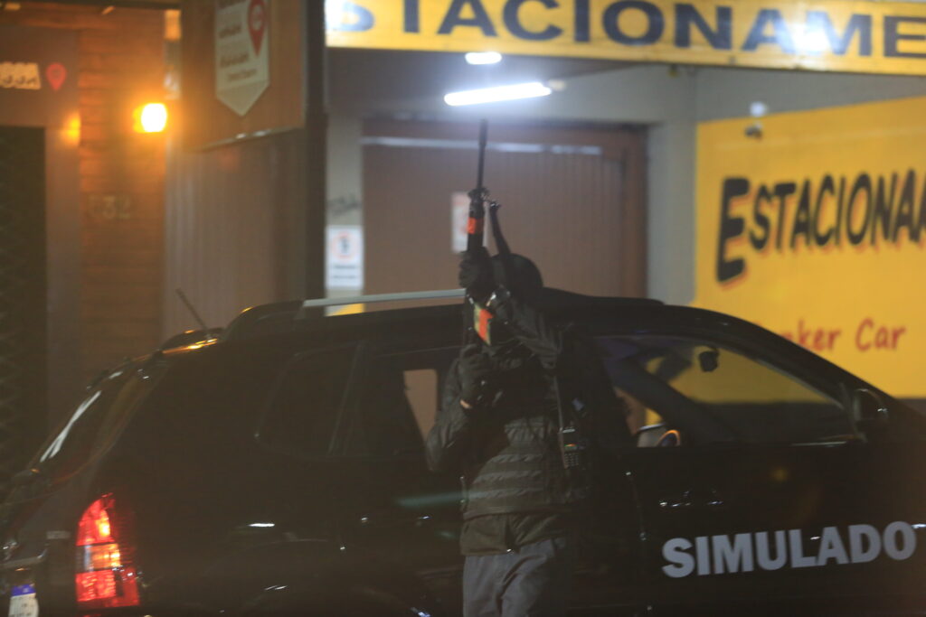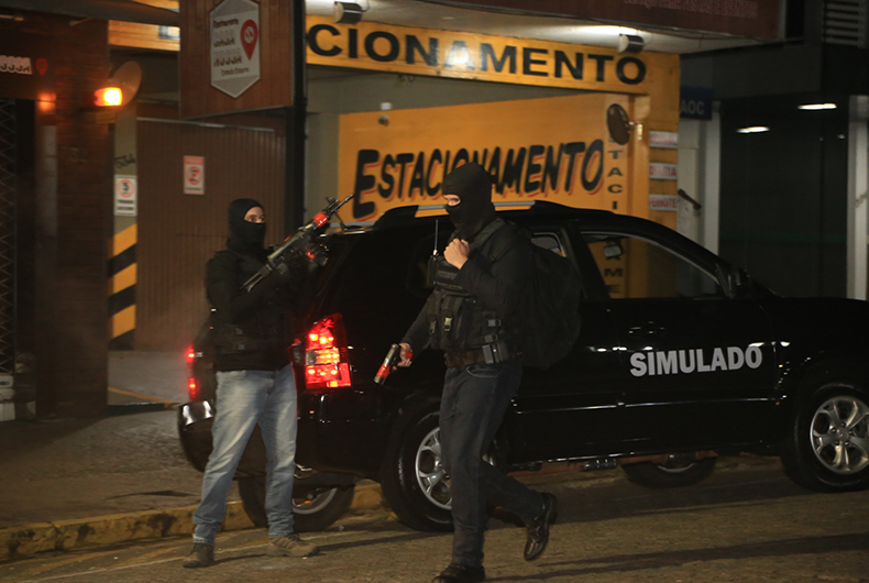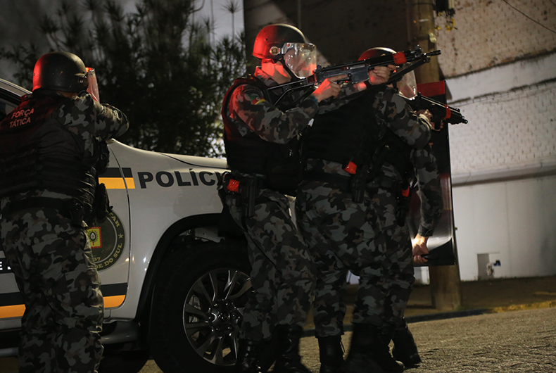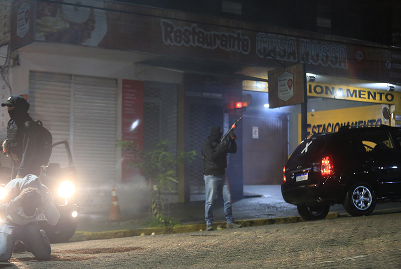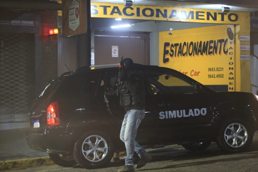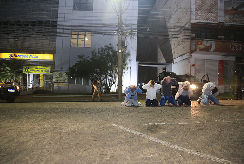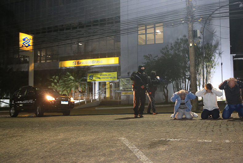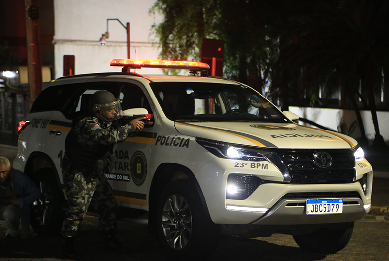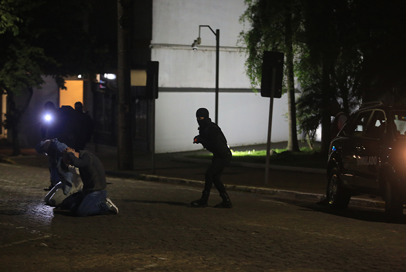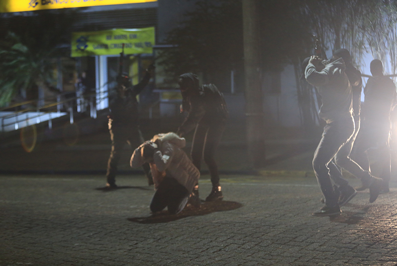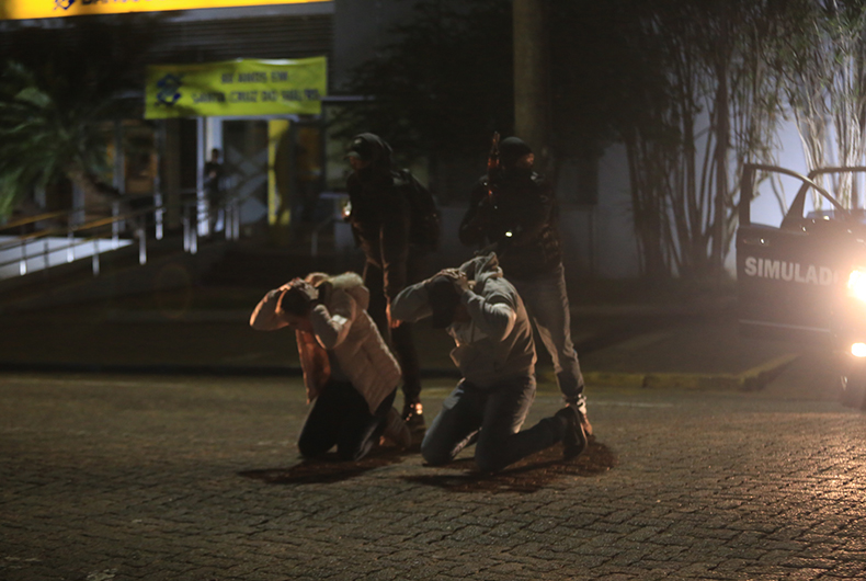 “Todo mundo quieto! Mão na cabeça se não vai morrer!”, disse um assaltante. Os disparos de arma de fogo e explosões que foram ouvidos na noite dessa segunda-feira, 12, em Santa Cruz do Sul marcaram aquele que é considerado o principal teste da Brigada Militar. Um exercício simulado, ocorrido em dois pontos de forma simultânea, junto ao Banco do Brasil, da Rua Marechal Deodoro, no Centro, e na Protege Transporte de Valores, na Rua Júlio de Castilhos, no Bairro Goiás, testou a perícia de dezenas de policiais militares, que se passaram por vítimas, criminosos e também agente de restauração da ordem pública.