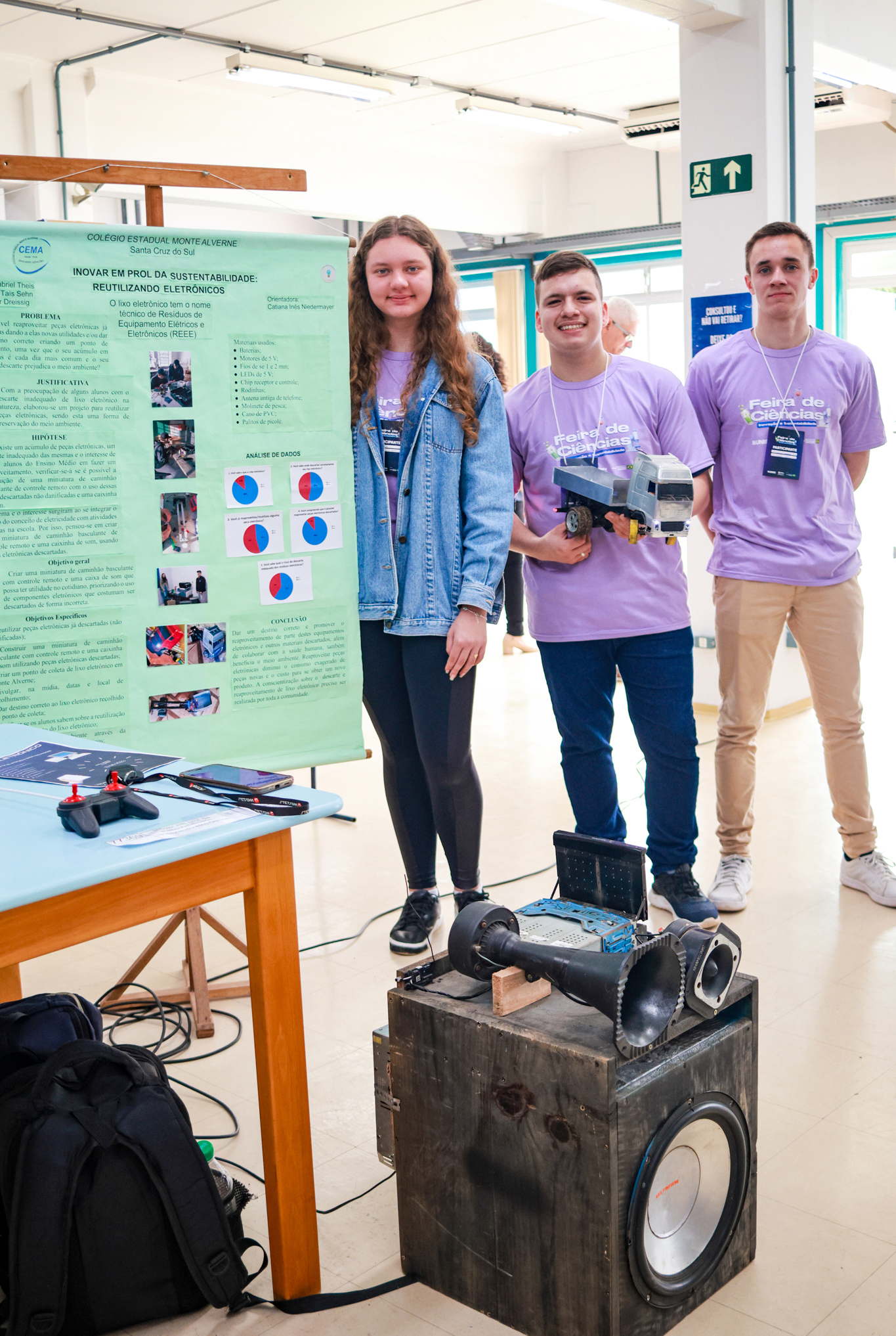 A ideia é do trio Gabriele Taís Sehn, 16, Diogo Gabriel Theis, 19, e Igor Artur Dreissig, 16 anos, estudantes do Ensino Médio do Colégio Estadual Monte Alverne. Durante o evento, realizado no salão de estudos da Biblioteca da Unisc, eles apresentaram com entusiasmo o projeto desenvolvido. “É uma felicidade enorme podermos estar aqui novamente”, disse Igor, relembrando a participação de 2022 que rendeu menção honrosa.