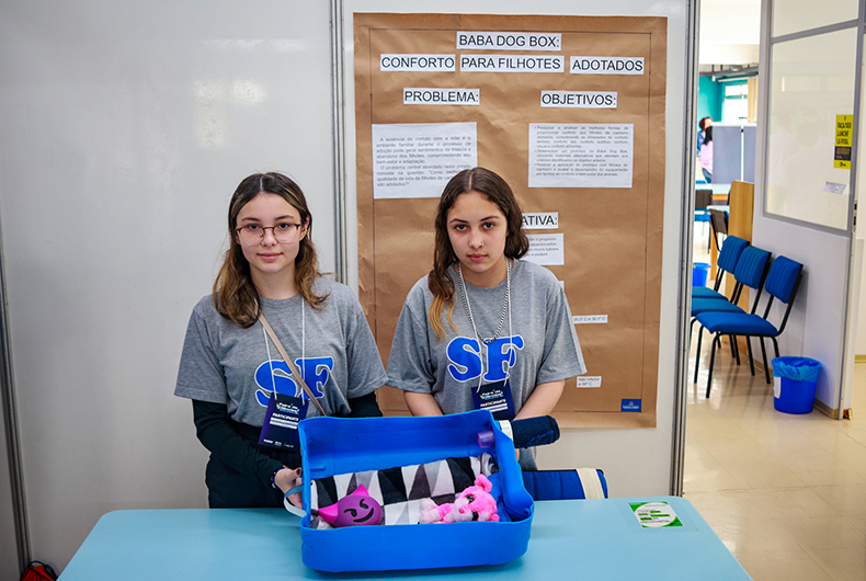 Logo adiante, as colegas Maria Antônia Meinhardt Trindade, de 14 anos, e Ludimila Severo Sampaio, 13, apresentavam ao público o Baba Dog Box. “Nós desenvolvemos uma caixa que possibilita conforto térmico, sonoro e visual para filhotes de cachorros em situação de abandono”, relevou Maria Antônia.