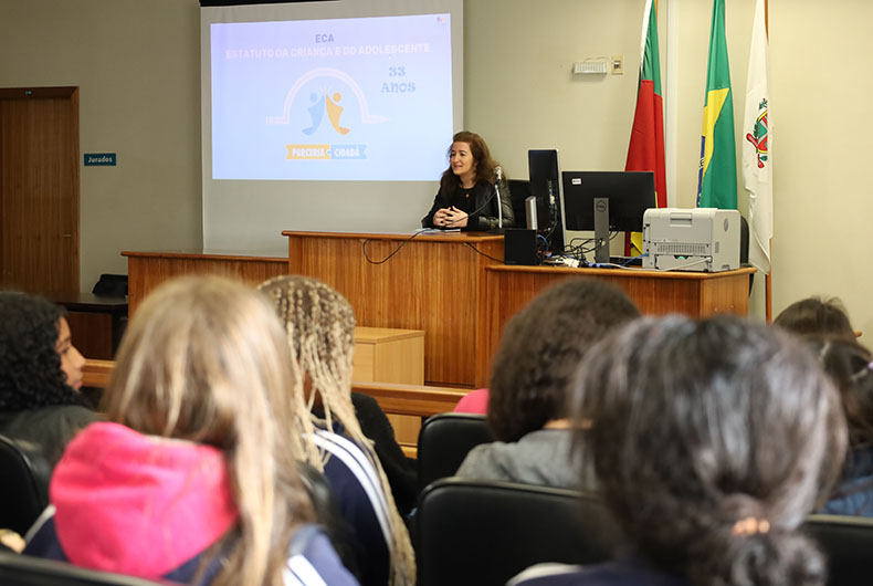 Inicialmente, os estudantes das turmas do 6º, 7º e 8º ano foram recebidos no salão do júri, onde ocorrem os julgamentos de crimes contra a vida. Ali, assistiram a vídeos explicativos e ouviram uma explanação descontraída da juíza de Direito do Juizado Regional da Infância e Juventude da Comarca de Santa Cruz, Lísia Dorneles Dal Osto.