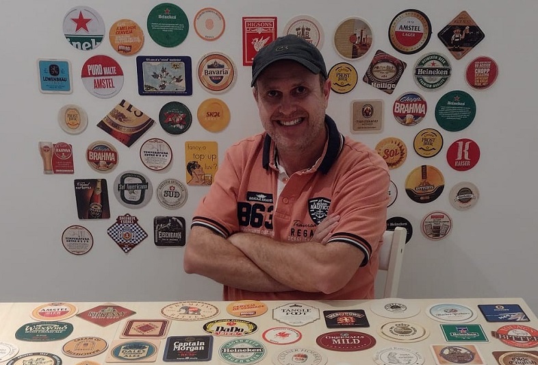 Fiquei curioso e espiei pela porta. Foi quando veio com um quadro e me disse: “Esse é um presente de colecionador”. Eram várias bolachas de cerveja, um item pronto para decorar o espaço do churrasco. Minha felicidade foi tanta que meu sorriso estava lá nas orelhas. Aí, depois daquele dia, toda vez que vou tomar um chope ou um amigo lembra do meu hobby, lá se guarda mais uma bolacha. Hoje, são centenas. Para esta reportagem até colei algumas na parede, mas guardo todas elas bem armazenadas.