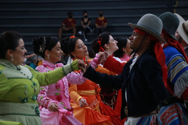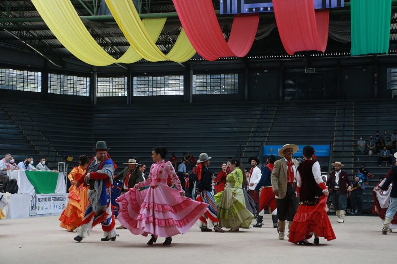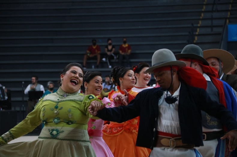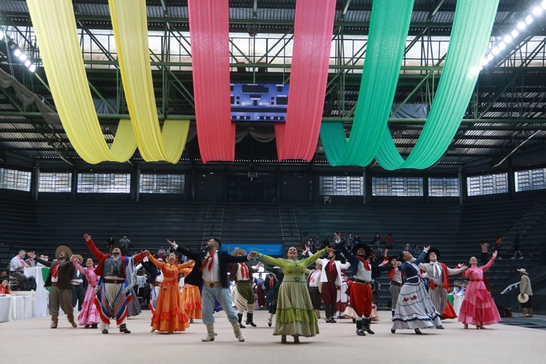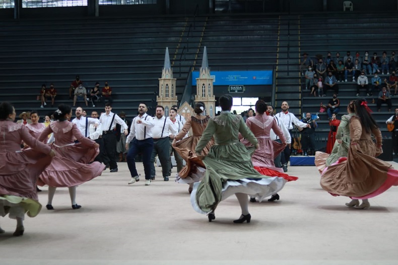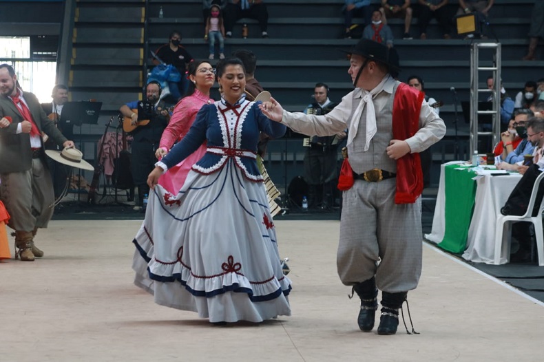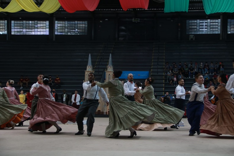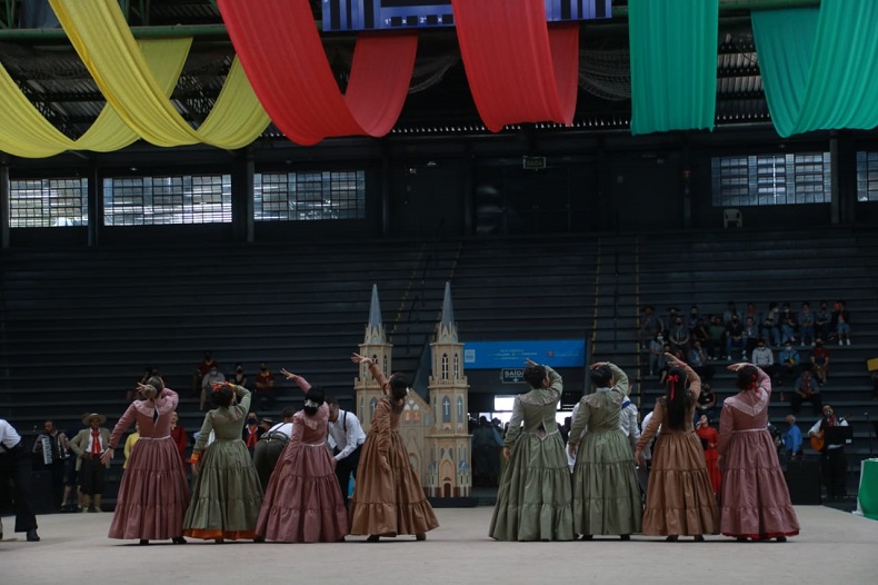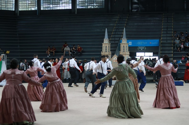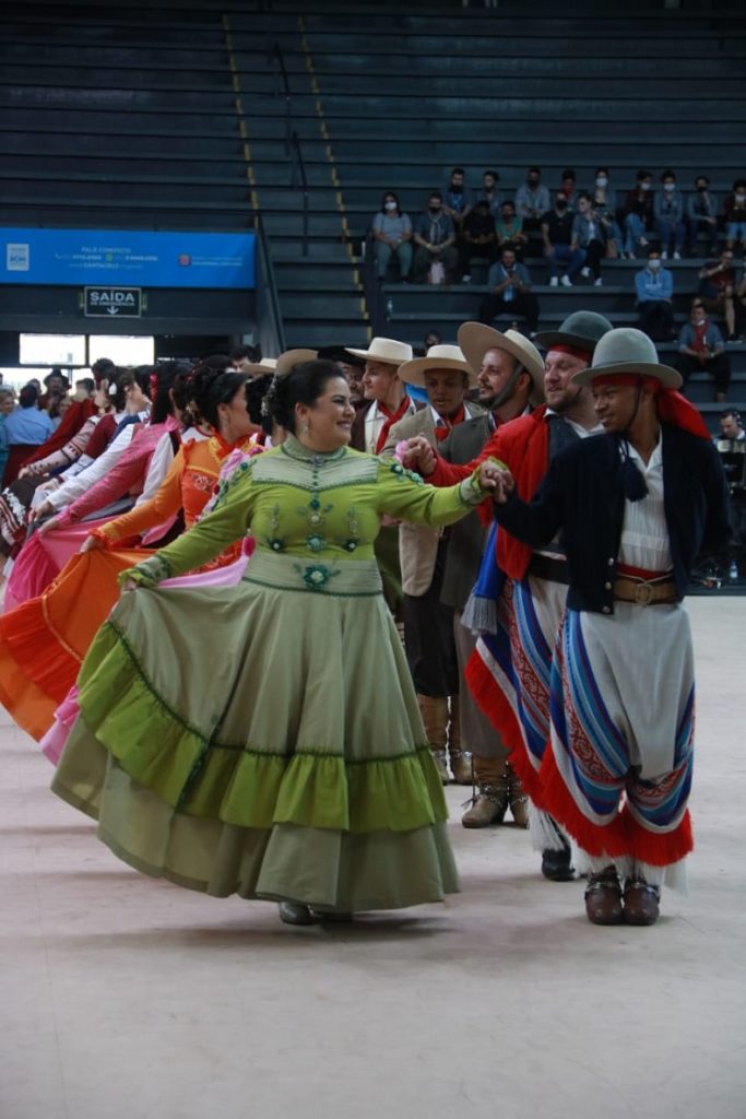 Após, o Lanceiros apresentou danças tradicionais como a chimarrita, o balaio e o chote inglês. Para isso, a equipe utilizou, cada um, indumentárias que foram utilizadas em outras edições do Enart, de 2008 a 2019. A diversidade das vestes causou um colorido no palco que encheu os olhos de quem pôde ver o espetáculo. O patrão do CTG Lanceiros, Luciano de Oliveira Pereira, observa que foi um momento emocionante, mesmo com o pouco público que pode entrar no Ginásio Poliesportivo devido à pandemia. “Foi a consagração de um trabalho que já tinha sido feito em 2010 e pudemos reapresentar para homenagearmos a nossa Catedral e a nossa cidade. Nosso CTG está sempre procurando homenagear as coisas da nossa região.
