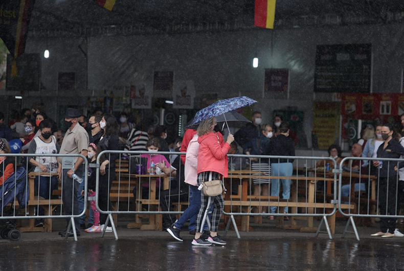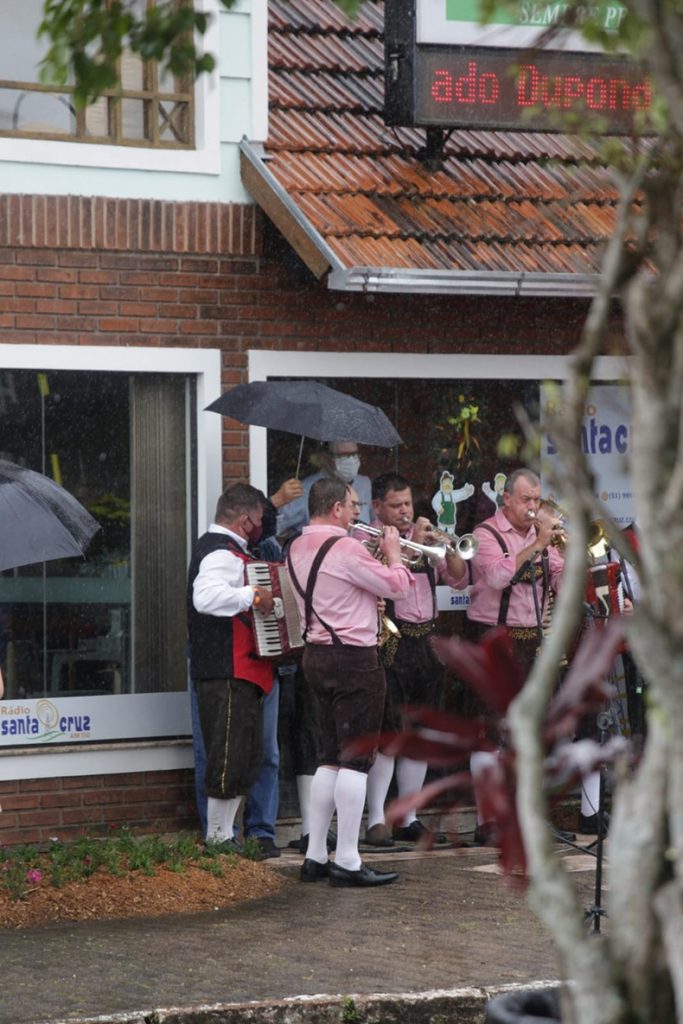 Quando a bandinha começou a tocar anunciando o desfile, no início da tarde desta segunda-feira, 11, caíram os primeiros pingos de chuva, que acabaram se intensificando durante a passagem dos carros alegóricos. O público procurou refúgio embaixo da lona, na praça de alimentação.