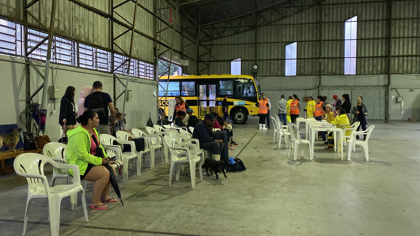 Os moradores desalojados do Bairro Várzea foram transferidos de ônibus para o pavilhão 2 do Parque da Oktoberfest. A mudança aconteceu por volta das 9 horas. Eles aguardavam no salão da Escola Municipal de Ensino Fundamental Guido Herberts.