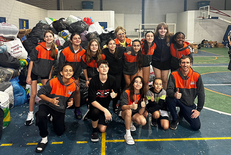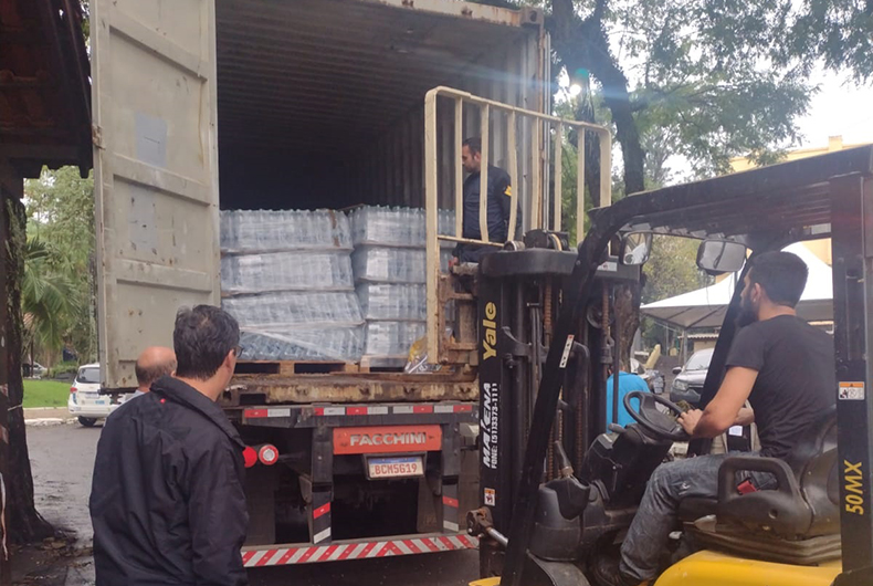 As doações de duas carretas foram descarregadas no ginásio de Linha Santa Cruz. Atletas da Associação das Meninas do Basquete, que teriam treino no local, auxiliaram as equipes.