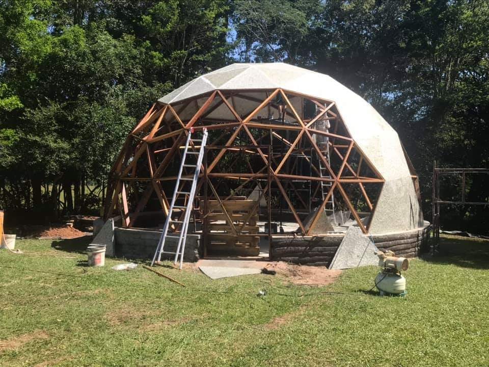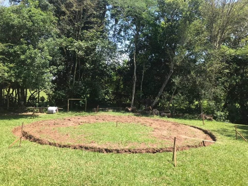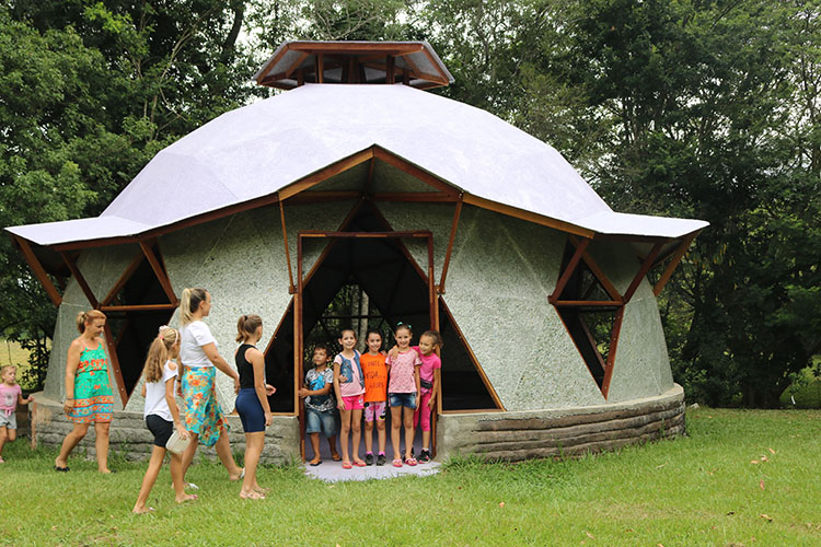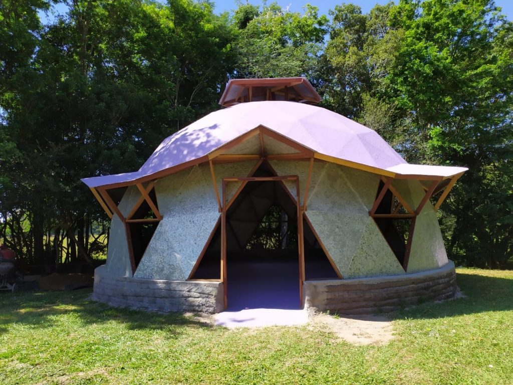 Com oito metros de diâmetro, a Casa Vivá é uma construção sustentável. A base da obra foi feita com uma técnica construtiva chaada hiperadobe, que utiliza terra ensacada com cimento para criar atrito.