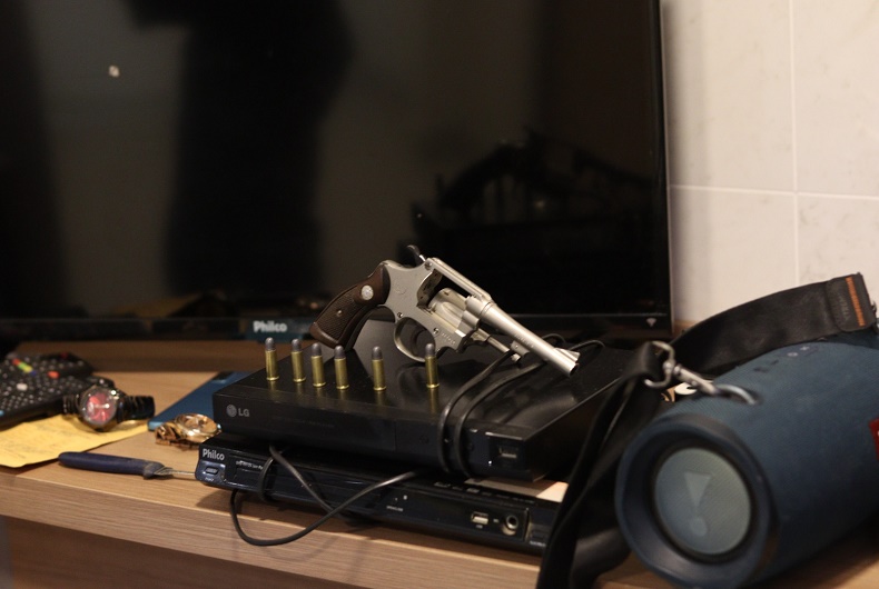 - 1 revólver Taurus calibre 32 , municiado com seis munições calibre 32