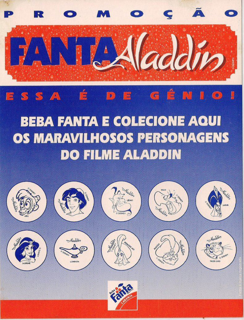 Em 1992, a Fanta lançou a promoção “Fanta Aladdin, Essa é de gênio!”. Para descolar uma das dez tampinhas com os personagens do filme Aladdin, você não precisava esfregar a lâmpada mágica; bastava beber uma Fanta laranja ou Fanta uva para encontrar seu personagem preferido. Além disso, a Fanta distribuiu cartelas para cada um colar suas tampas. Na promoção, você também podia encontrar a tampinha premiada, que dava direito ao boneco do Gênio, camisetas e copos.