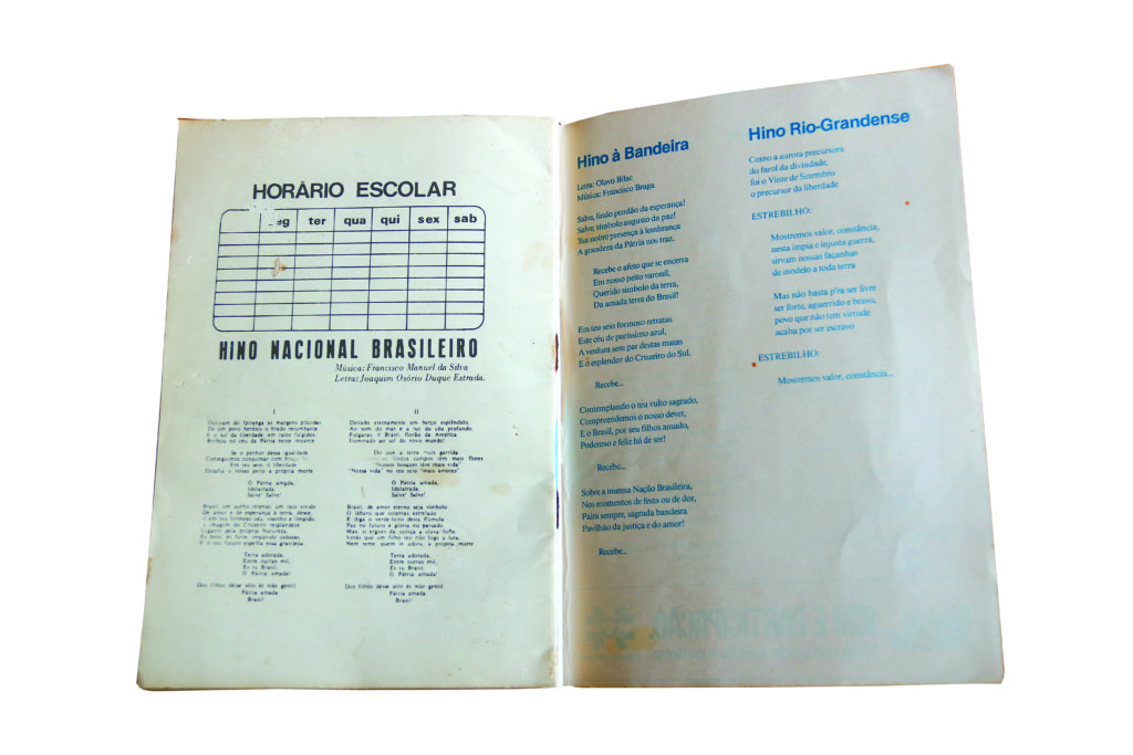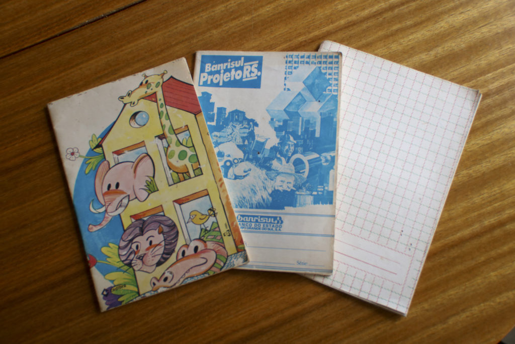 Mesmo vivendo na era digital, acredito que eles jamais serão substituídos. Hoje, vou apresentar uma turma essencial para as séries iniciais da escola. Estou falando dele: o caderno. Na minha época, eram necessários quatro tipos de cadernos: o simples, o de caligrafia, o quadriculado e o de desenho. Suas capas eram, na maioria das vezes, sem estampa e sem graça; então, encapávamos com papel de presente para ficar mais bonito. Na contracapa, alguns vinham com o Hino Nacional, o Hino da Bandeira e o Hino Riograndense.