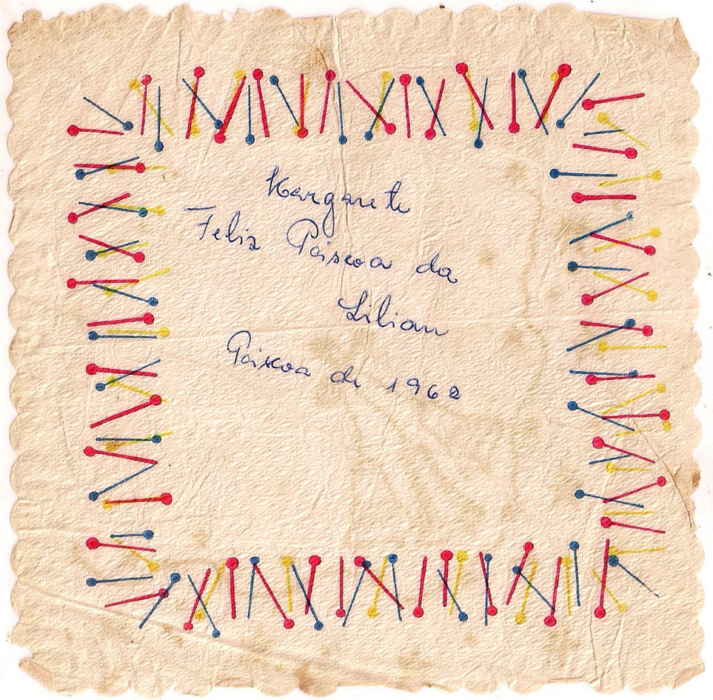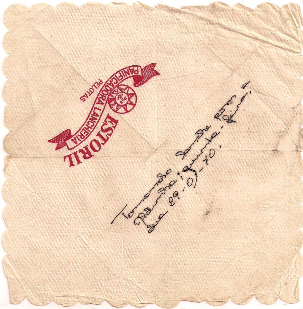 Então a senhora saiu da sala e, quando voltou, desta vez a caixinha vinha abarrotada de guardanapos de papel. Nunca havia visto uma coleção dessas. Fomos olhando, e cada guardanapo trazia uma história: ou tinha sido uma viagem, ou uma festa, ou um cumprimento, ou até mesmo a simples lembrança registrada de um lanche. São mais de 150 guardanapos. Disse para a senhora que não poderia ficar com tamanha responsabilidade, pois ali não eram só papéis ou guardanapos; eram memórias.
