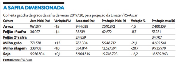 No caso dos grãos, todas as culturas da estação foram de alguma forma afetadas, mas mais diretamente o milho, grão essencial para alimentar as cadeias de carne (bovina, suína e de aves) e de leite. Os dados coletados pela Emater na segunda quinzena de fevereiro levam em conta 99% da área a ser cultivada com arroz, 82,9% do feijão de primeira safra, 83,4% do feijão de segunda safra, 97,3% do milho grão, 96,1% do milho para silagem e 98,1% da área de soja.