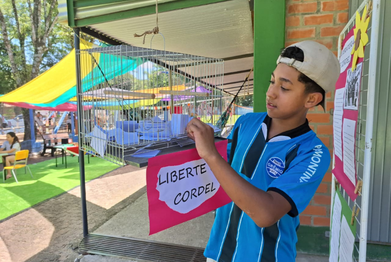 Em um dos espaços, em uma gaiola suspensa, confeccionada com papel, com o título Liberte um Poema, quem se aventurou na pescaria foi o garoto Davi Escouto Laufrem, de 10 anos. “Ficou bonito isso aqui. Achei muito legal porque em casa não leio muito, e aqui na escola leio mais”, confessou.