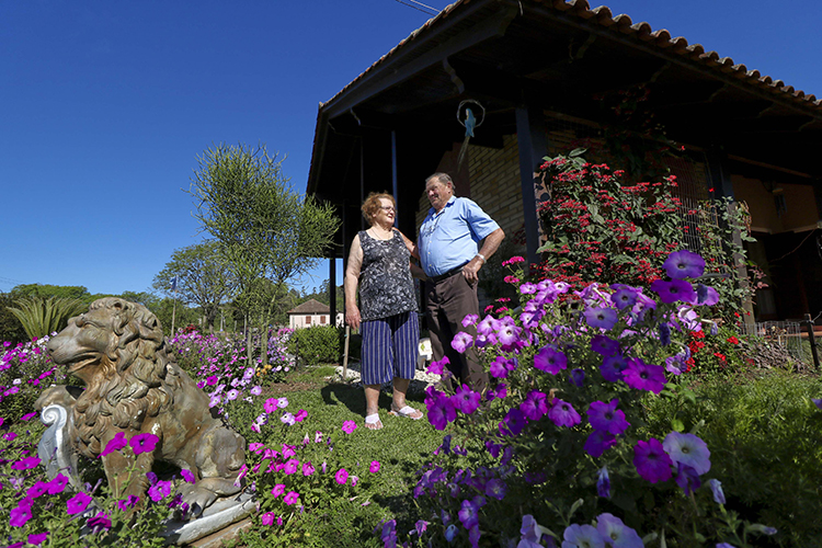 Aos 79 anos, Hildegard supervisiona o plantio, atribuição do esposo, Arno José, que tem 85 anos. Ele semeia as petúnias, faz as mudas e replanta. Tem ajuda para cortar a grama, mas é o responsável pela parte operacional do jardim. “É preciso cuidar das plantas em uma atividade quase que diária”, diz o aposentado. Somente a tarefa de regar as plantas, com água de poço para não consumir água tratada, leva em torno de uma hora.