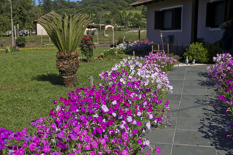 Hildegard conta que escolheu a flor há muito tempo pela beleza e durabilidade das petúnias. Semeadas em maio, as mudas vão para os canteiros entre os meses de julho e agosto. Elas sobrevivem floridas até a entrada do verão. “Eu levanto de manhã, às vezes uns minutinhos antes, para ficar admirando este jardim”, revela a aposentada.
