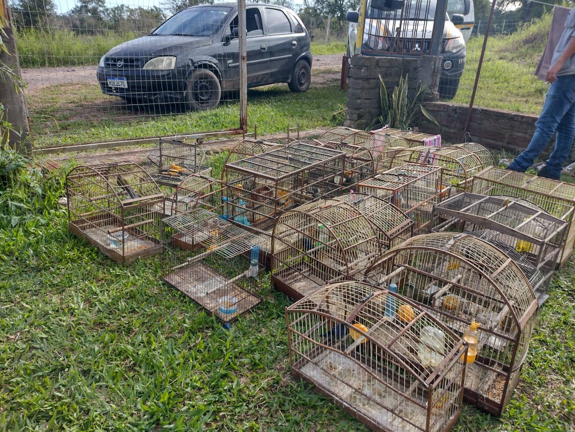 Um homem de 30 anos mantinha em casa 23 pássaros silvestres, entre canários-da-terra, trinca-ferros, azulões, cardeais, sanhaço-frade, sargento, coleirinho e coleiro-do-brejo. Além dos animais, foram flagrados instrumentos de captura, todos armados, para obtenção de novas aves.