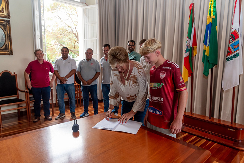 A prefeita de Santa Cruz do Sul, Helena Hermany, sancionou na tarde dessa quarta-feira, 5, lei autorizando o Município a ceder um imóvel para uso da Associação Genoma Santa Cruz. O ato ocorreu no Salão Nobre do Palacinho, com a presença de secretários, vereadores, representantes da entidade, alunos e familiares.
