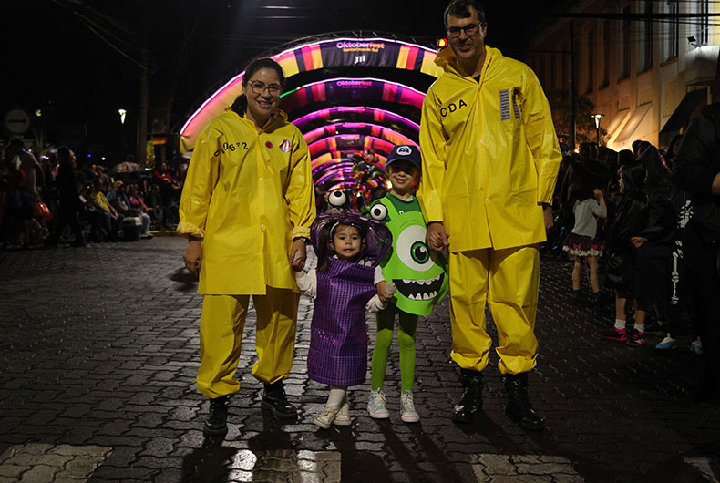 Entre tantas pessoas estavam Mariele e Marcos Costa dos Santos, que levaram as filhas Alice e Laura. Eles foram de Monstros S.A. e sempre adotam uma família para ilustrar. Ano passado, os moradores do Bairro Bonfim foram de Família Stranger Things.