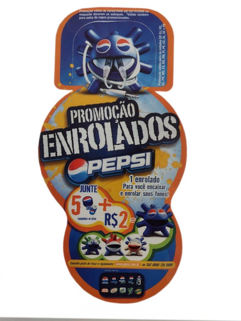 A Promoção Enrolados Pepsi agitou a garotada entre agosto e outubro de 2008, período em que a ação estava sendo realizada. Para você descolar um Enrolado, bastava juntar cinco tampas ou cinco latas da promoção, que, com mais R$ 2,00, davam direito a escolher um dos quatro modelos, que exibimos nesta página. O Enrolado era um boneco decorativo para enrolar seus fones de ouvido. Além das tampinhas ou das latas, era possível juntar cinco selos de copos promocionais. Neste colecionável, dava para armazenar os fonezinhos de ouvido de celular para sempre saber onde encontrá-los, ou não extraviá-los. E todos queriam ter os quatro modelos, claro!