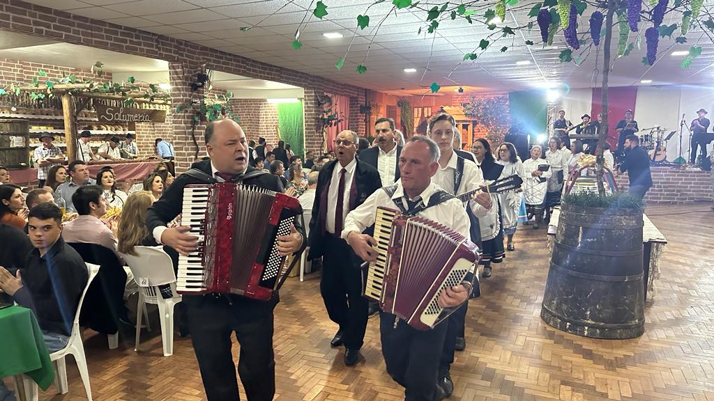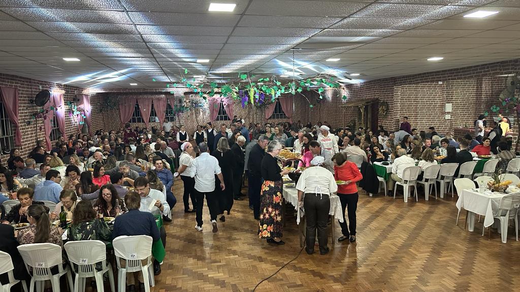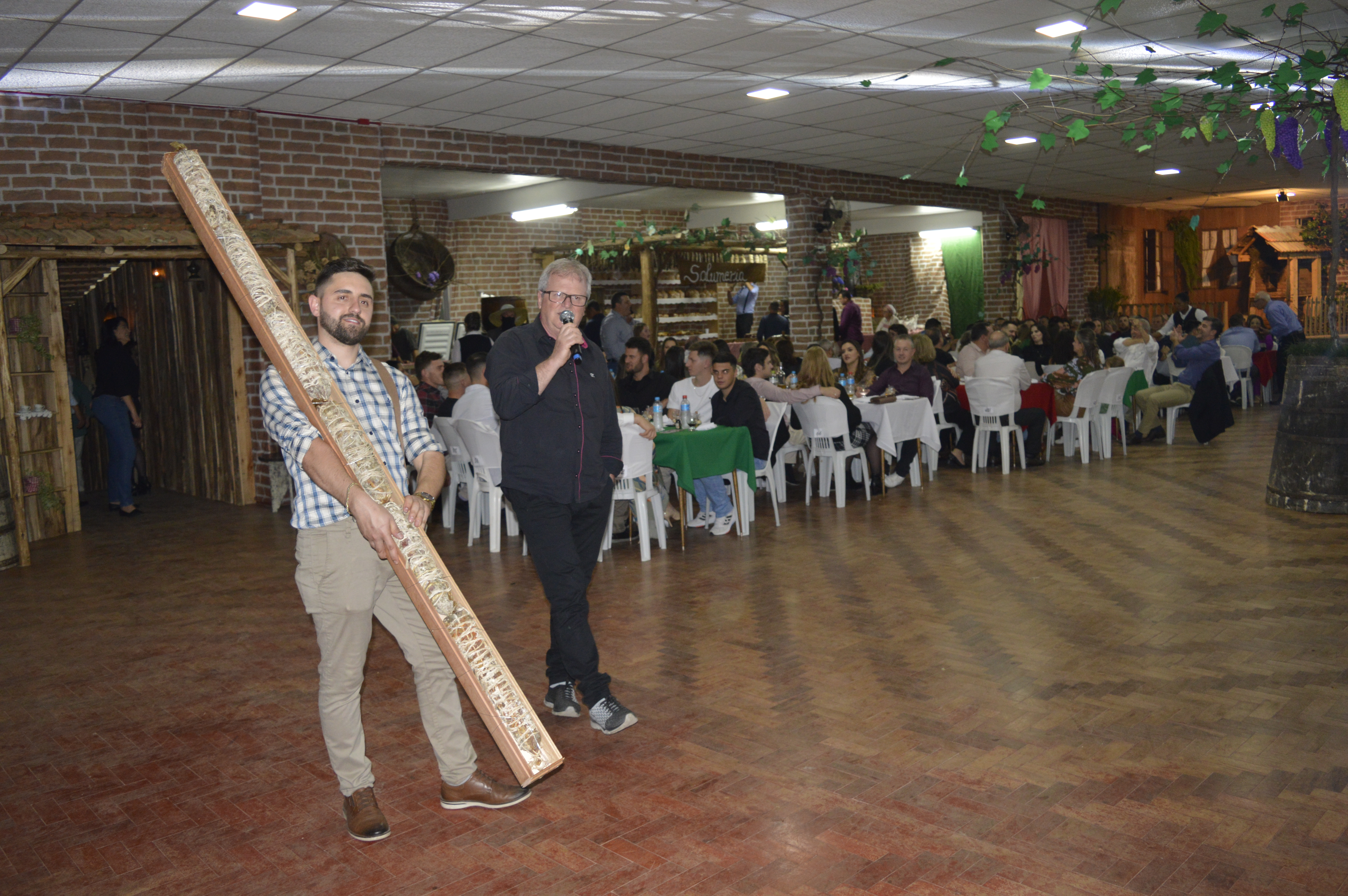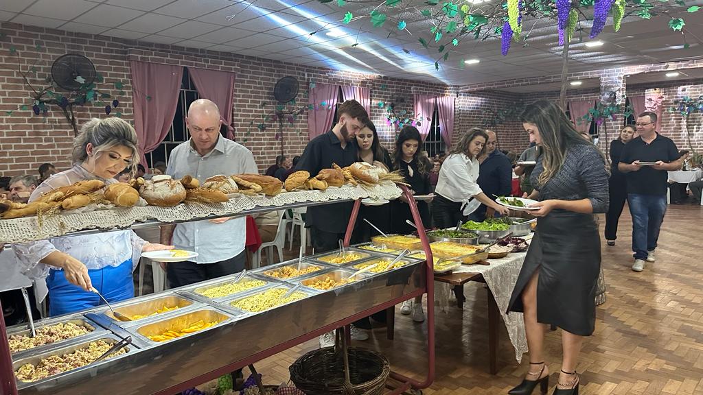 Já no salão, o ambiente esteve todo decorado, desde as paredes de pedra, parreiral, elementos nas cores da bandeira italiana, passando pela Salumeria (espaço destinado aos salames, presunto, queijo, grostoli e pão), copa e pipas de vinho e graspa.