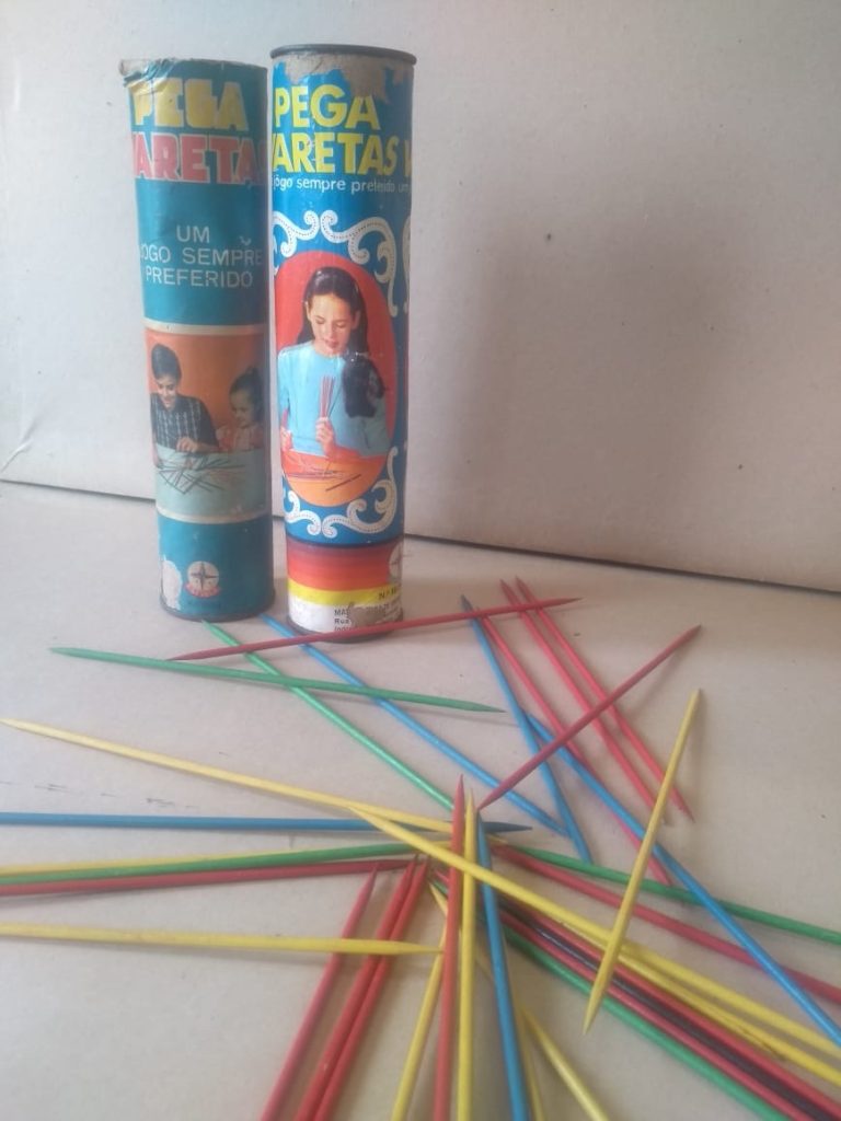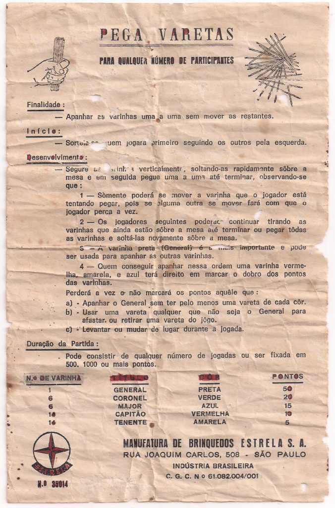 O jogo de pega-varetas ultrapassou várias gerações. Minha avó, minha mãe e eu já brincávamos, e agora meus filhos brincam. A finalidade do jogo é retirar a vareta uma a uma sem mover as restantes. Elas são denominadas por cores e nomes: preta = general; verde = coronel; azul = major; vermelha = capitão; e amarela = tenente. Mais à direita, o manual de instruções.