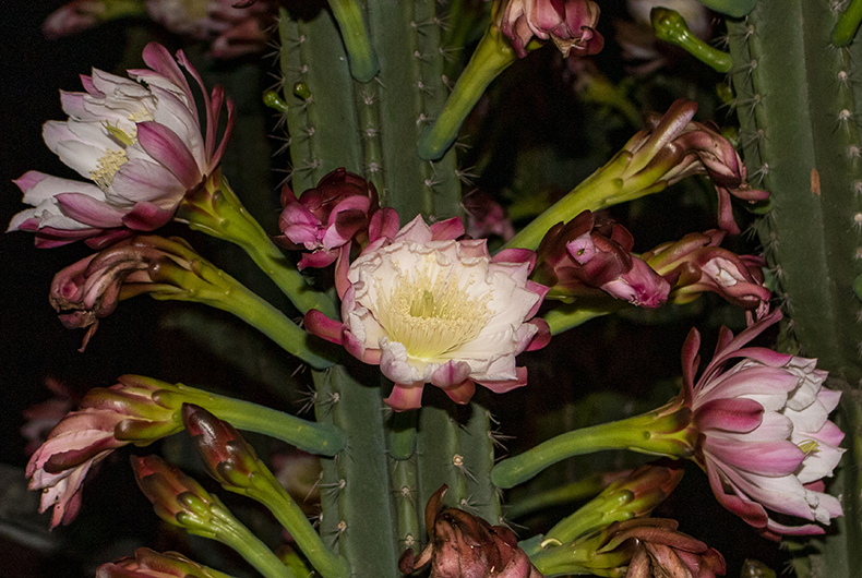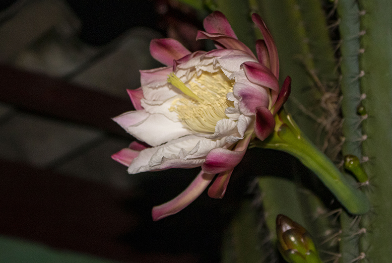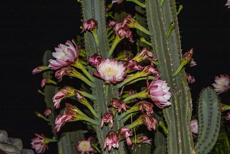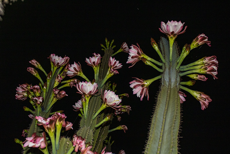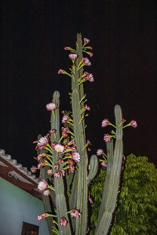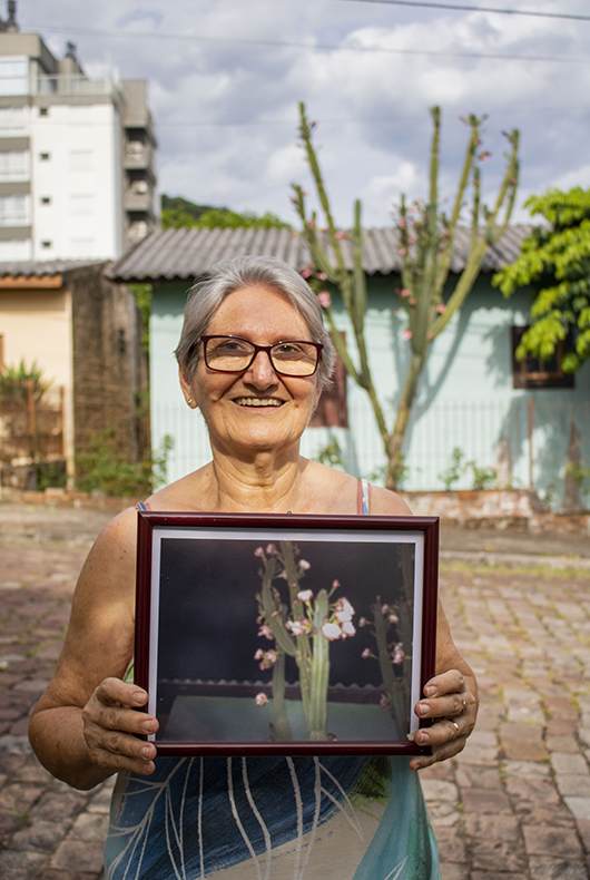 Enquanto o vizinho ignorava o cacto, Iria acompanhou por anos o desenvolvimento da planta, até que, há cerca de cinco anos, notou a floração no final do dia. “É lindo demais”, admitiu. Foi tamanho entusiasmo que, em uma noite, fotografou as flores para fazer um quadro. “Convenci ele a não cortar, pois é uma relíquia.” Pouco a pouco, a floração começou a aumentar cada vez mais. “Esse ano foi o que mais deu flor”, comenta Iria.